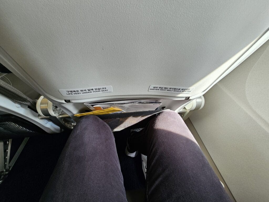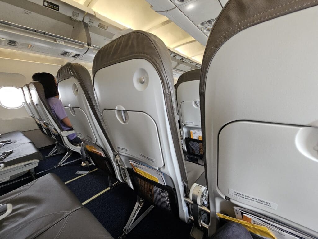 Looking online, photographs of Aero K’s cabins revealed the seats within these to be slim and modern, and in keeping with the airline’s brand colours, are covered in a blue and yellow pleather. Eager to sample this seat, as I passed through the windbreak I was a little disappointed to be presented with the familiar sight of 180 ironing board like Recaro SL3510 seats. From 2018 until 2024, these were the International Airlines Group’s seat-of-choice for their narrowbody Airbus fleet, found on the jets of British Airways, Iberia, and the group’s low-cost carrier, Vueling. This serves to explain how this seat ended up in Korea. Other than the removal of most Spanish signage, the aircraft’s cabin had undergone virtually no transformation since its days with Vueling, with each seat covered in a grey pleather cover, the only addition being a fabric antimacassar that sported Aero K’s motif. Meanwhile, on the inner side of the overhead locker doors, Vueling decals could be seen advising passengers to stow smaller items under their seats. As you may be able to guess, the Recaro SL3510 is far from my favourite seat model, and having had the (dis)pleasure of sitting in them on slogs across Europe with British Airways, I can safely say that these are cramped, firm, thin and spartan, offering nothing more than a coat hook, a small tray table and a seatback pocket.
