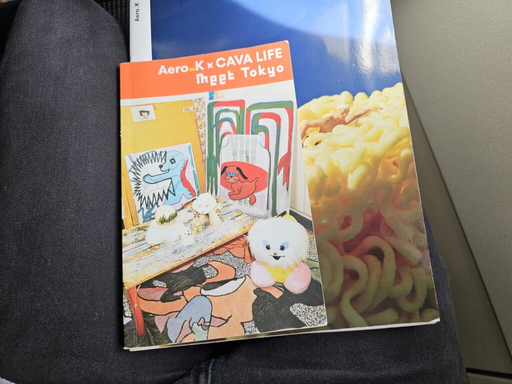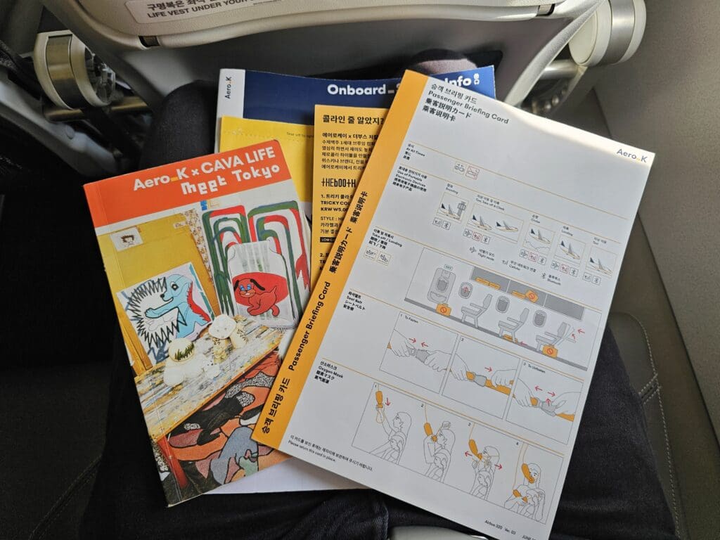 Following my quick lavatory visit, I returned to my seat and squeezed in for the short journey ahead. As I had suspected, the seat was uncomfortable and cramped, being as hard as an ironing board and offering very little in the way of legroom. Interestingly whilst the aircraft lacks any sort of inflight entertainment system, the amount of space was further limited by the presence of a rogue inflight entertainment box. However, all was not doom and gloom, as despite the aircraft’s long career with Vueling, I found the seat and surrounding area to be in good condition with very few signs of wear and tear. Meanwhile, this was also spotlessly clean and tidy. Turning to the seatback pocket, this contained the all-important safety card, a sick bag, an onboard shopping menu and a promotional card advertising three drinks for sale brewed by Seoul-based microbrewery, the Booth Brewing Co., as well as something of a Tokyo guide published in cooperation between Aero K and Cava Life.