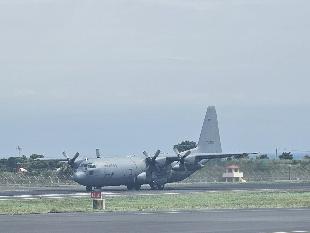 No more than a couple of minutes after I had taken my seat, the second and final bus load of passengers pulled up to the aircraft and I was soon joined by two muscly seatmates who appeared that they may well have been in town for the local bodybuilding competition. Thus guaranteeing that I would be squeezed up next to the window for the ride up to Cheongju!  At this stage of the journey, water vapour could be seen steaming out of the air conditioning vents, however, for those not expecting this, the cabin crew made multiple announcements in Korean and English advising passengers that this was nothing to worry about. As I waited, looking outside, all bags appeared to have been loaded up into the belly of the aircraft with plenty of time to go until departure. Meanwhile, I managed to spot a noisy ROKAF Lockheed C-130 Hercules rocketing down the runway at the start of its flight back to the mainland, with this being one of two such aircraft spotted in Jeju that morning.