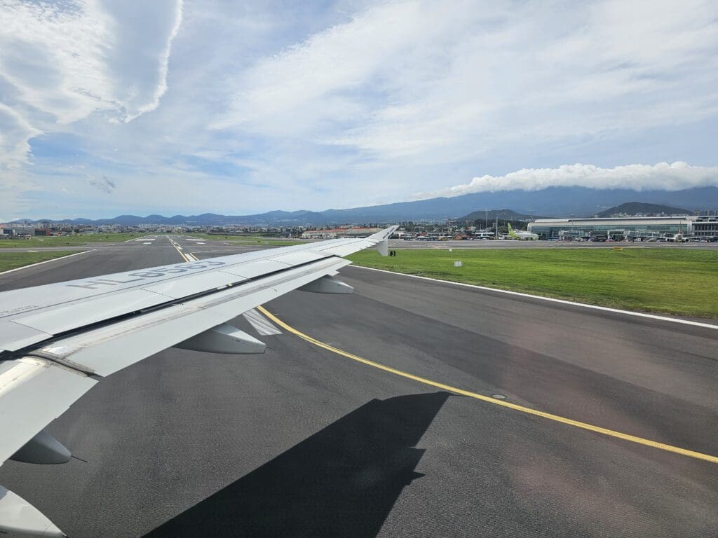 Many would argue that, unlike a safety video, a safety demonstration is a safety demonstration, and there isn’t much that distinguishes one airline’s demonstration from another’s. However, likely in an attempt to capture passengers’ attention, this seemed to be a little more upbeat and lively when compared to your bog standard run-through of the emergency procedures. For example, this commenced with a rather over-the-top clap that most certainly managed to draw my attention!  As this demonstration took place, the Airbus’ two CFMI CFM56-5B4/P engines hummed into life accompanied by the Airbus A320 Family’s famous squeaky ‘barking’ noise. One advantage of our parking position was that, like many of Jeju International Airport’s remote stands, no pushback was needed and so, despite the late end to boarding, the Airbus powered forward out of its stand just seven minutes after our scheduled departure time.