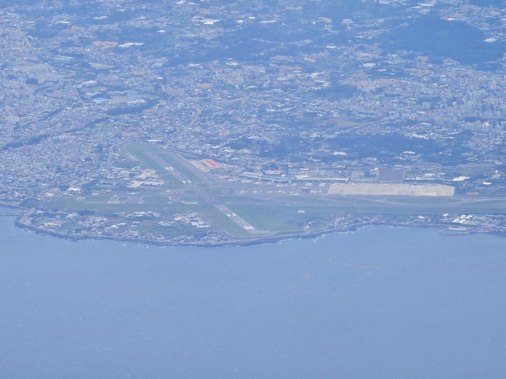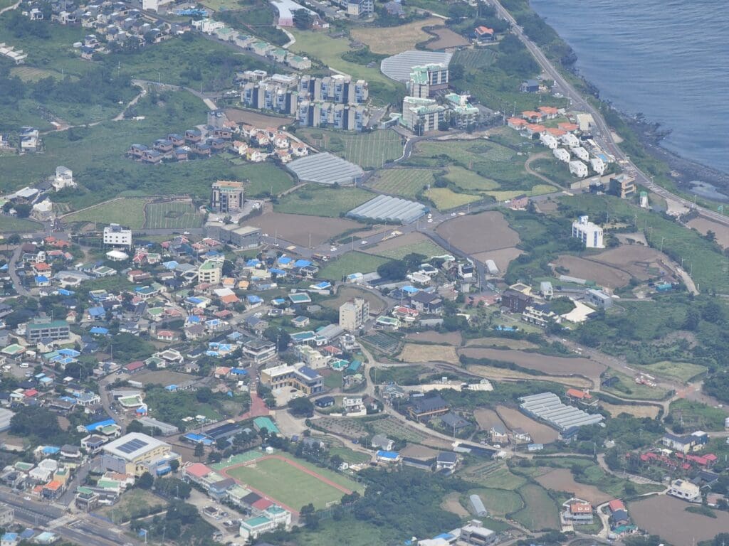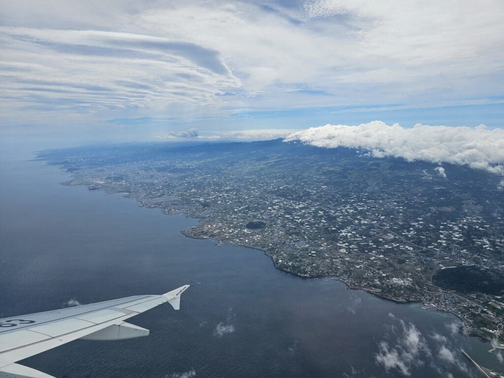 Moments after taking to the skies, we began to be shaken around a little, with a reasonably strong crosswind blowing across the runway that morning. Meanwhile looking outside, I was treated to good views of the blue seas and parts of Jeju’s northern coastline. During the initial stages of our climb, I caught sight of Dodubong, a small hill to the south of the airport, as well as Iho Tewoo Beach and the Gueom Stone Salt Flats before we reached one of Jeju’s largest towns, Aewol. Upon reaching Aewol, the Airbus turned onto a northerly heading and began its short trip across the stretch of sea that separates Jeju from South Jeolla Province.