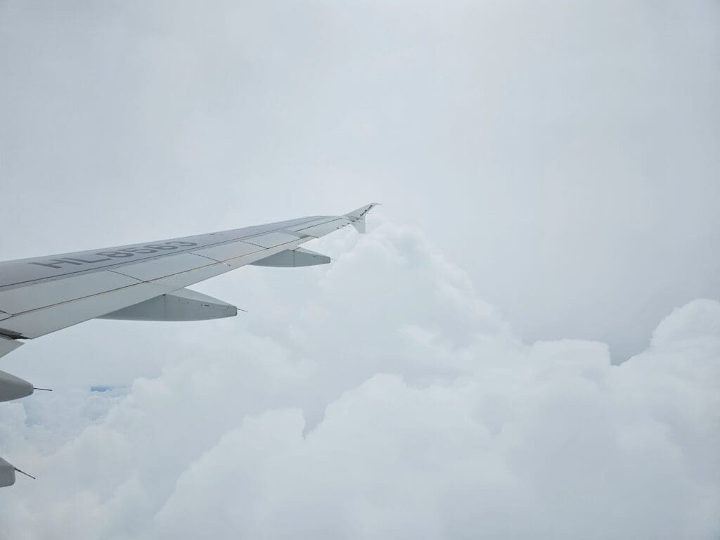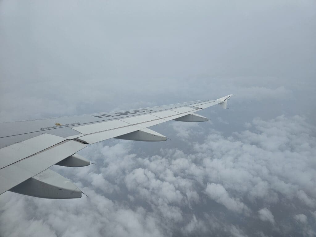 As we crossed the stretch of sea between Jeju and the mainland, clouds rolled in below and blocked any views of the ground below until we were on the approach to Cheongju. As we neared the cluster of islands that sit off the coastline of South Jeolla, the Airbus levelled off at its low cruising altitude of 17,000 feet and soon the First Officer’s voice filled the cabin. Undertaking their welcome announcement in Korean and English, they noted the flight time to be 55 minutes, provided an update on the weather in Cheongju, which was 24 degrees, ultra-humid and accompanied by constant rain for the rest of the day, thanked passengers for flying with Aero K and encouraged passengers to keep their seatbelts fastened as we would likely shortly be facing some turbulence. Indeed, true to this, as we made our way from the South Jeolla coastline towards the region’s largest city, Gwangju, the Airbus bumped around and we experienced what was in places, some rather rough turbulence. Almost as soon as we hit this, the seatbelt signs were illuminated, and, given the short flight time, remained on for the rest of the journey, whilst the crew passed through the cabin ensuring all was secure.