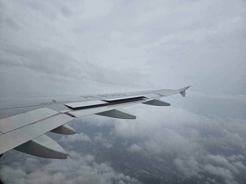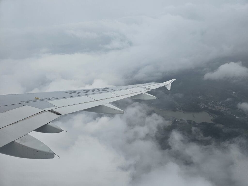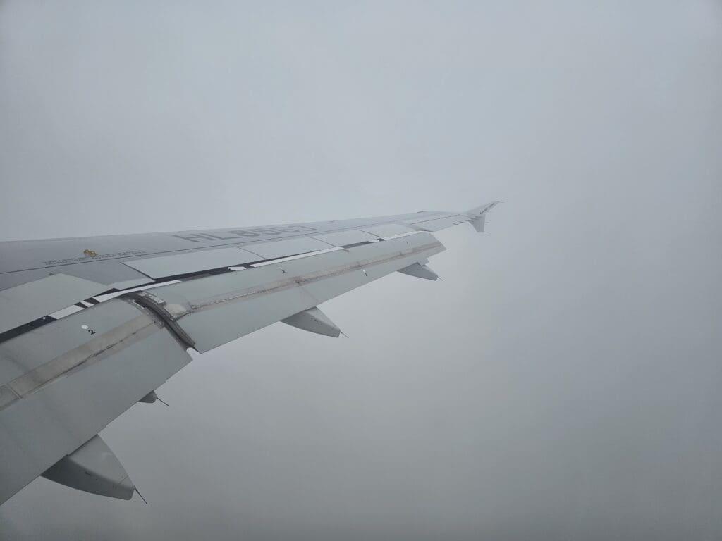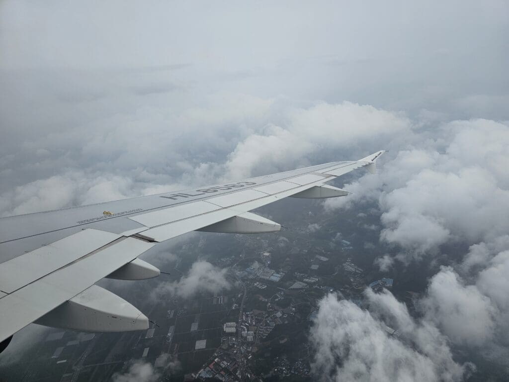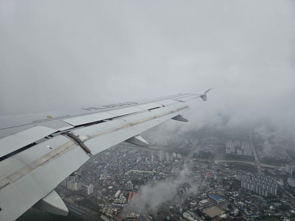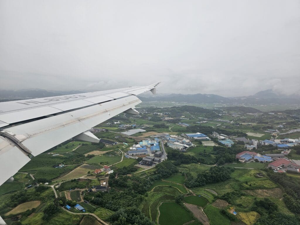 Trundling up the western side of the provinces of North Jeolla, South and North Chungcheong, not too far from the sea, the Airbus descended past the cities of Gunsan and Iksan, at which point the rain-soaked green rural landscapes of the region temporarily popped into view. Unfortunately, thanks to that day’s rainy weather and low clouds, nothing could be seen of the mountainous landscapes below as we flew to the west of Korea’s fifth largest city, Daejeon, followed by Sejong City. Soon, the aircraft turned towards Cheongju Airport and the flaps were partially extended in preparation for arrival, however, at this point, nothing could be seen as we sank lower and lower towards the ground.