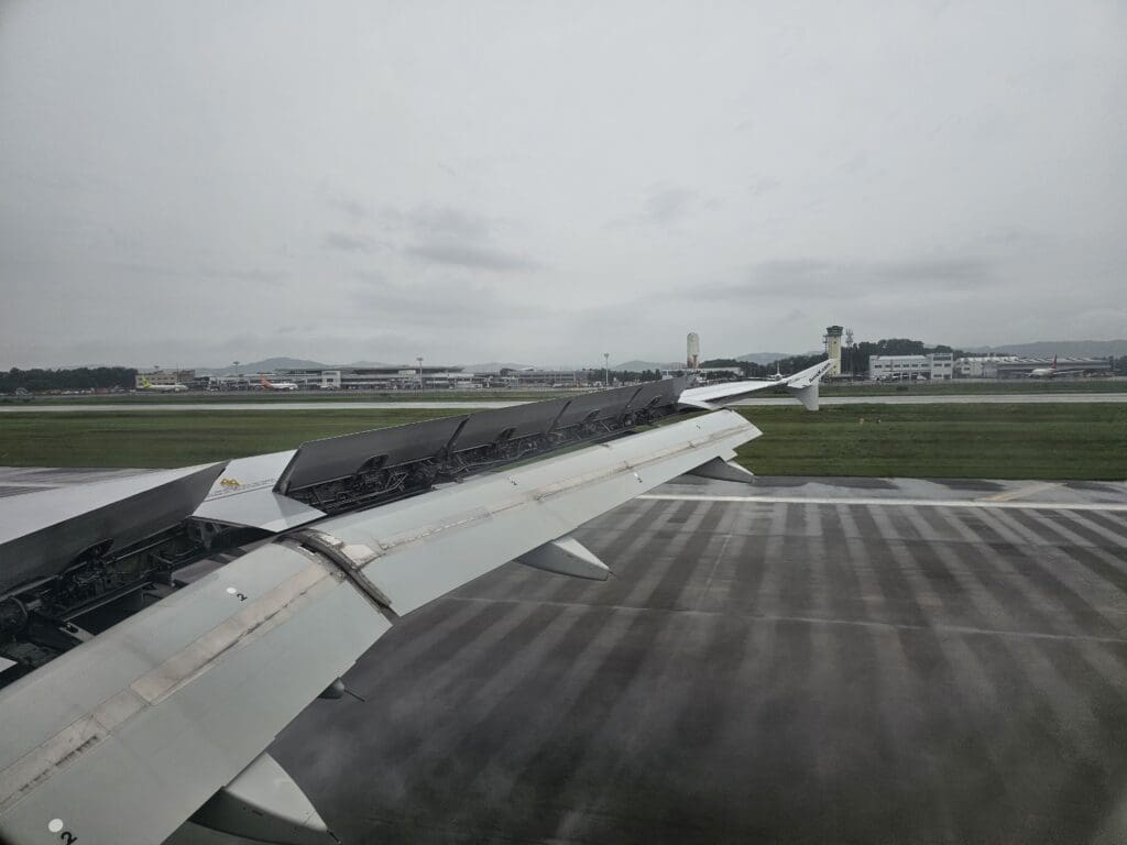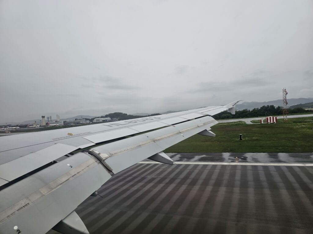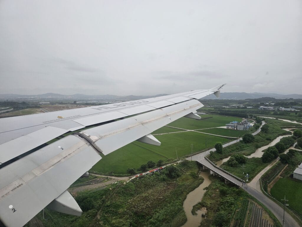 Eventually, just after the aircraft turned onto finals for Cheongju Airport’s Runway 25R, the clouds parted and revealed the rural landscape consisting of fields, farms and the odd factory, as well as the small town of Jeungpyeong as full flaps were extended and the landing gear was lowered into position into preparation for our arrival. Before I knew it, the Airbus passed over the very well-guarded airport perimeter, before making a soft touchdown on the drenched Runway 25R, ending our 48-minute journey through the Korean skies. Almost instantly, Cheongju Airport’s modern terminal appeared where a cluster of airliners could be seen waiting for their next missions. Sadly, nothing of the airfield’s locally based squadrons of fighter jets could be seen, with these all tucked away safely in their hangars and well out of the view of the general public!