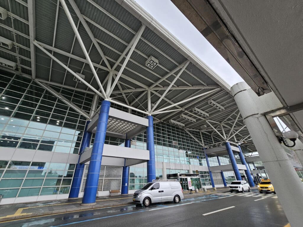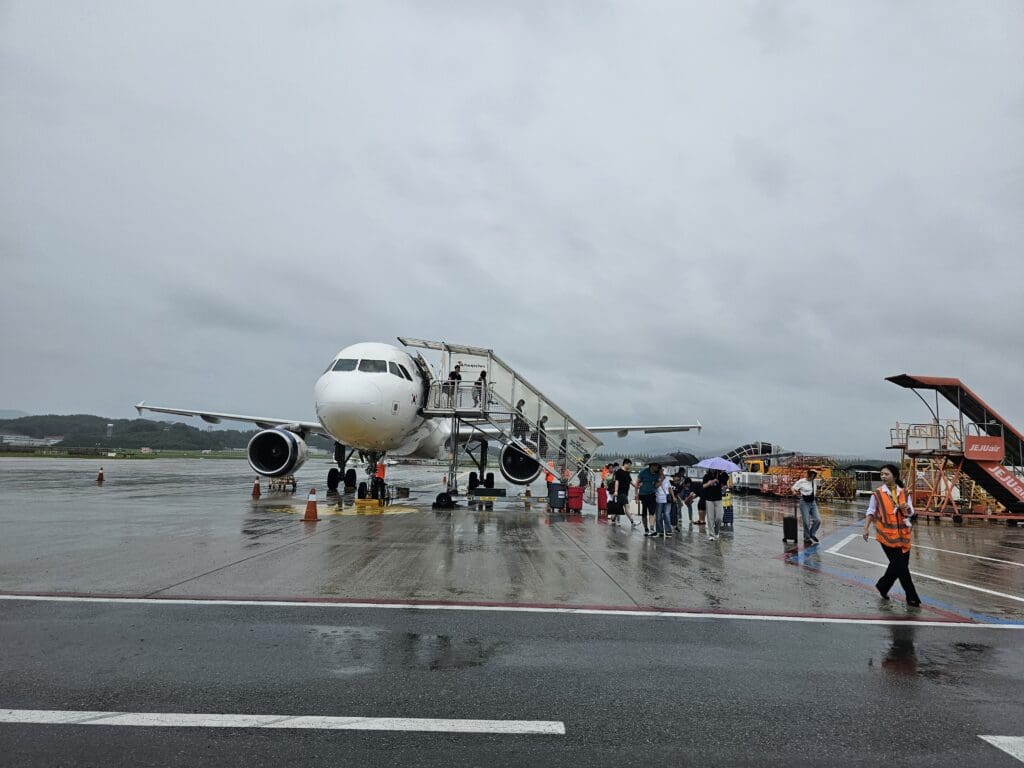 Following a short and uneventful taxi, the Airbus pulled into Stand 1 where it joined the aforementioned Jin Air jet although this soon pushed back at the start of its journey to Jeju. Thanks to the departure queue in Jeju, the Airbus came to a halt ten minutes behind its scheduled arrival time at 1135. Once the engines spooled down and the beacon light had stopped flashing, an army of rather soaked Swissport agents scrambled into position and began to empty the holds of passengers’  bags. Meanwhile, inside, passengers flocked to the aisles although it seemed to take a few minutes until disembarkation commenced. After a few minutes, I stood up and began to make my way through the now mostly empty cabin. Upon reaching the forward galley, I received a friendly farewell from the same two flight attendants who had greeted me an hour or so earlier before I stepped onto the covered air stairs.