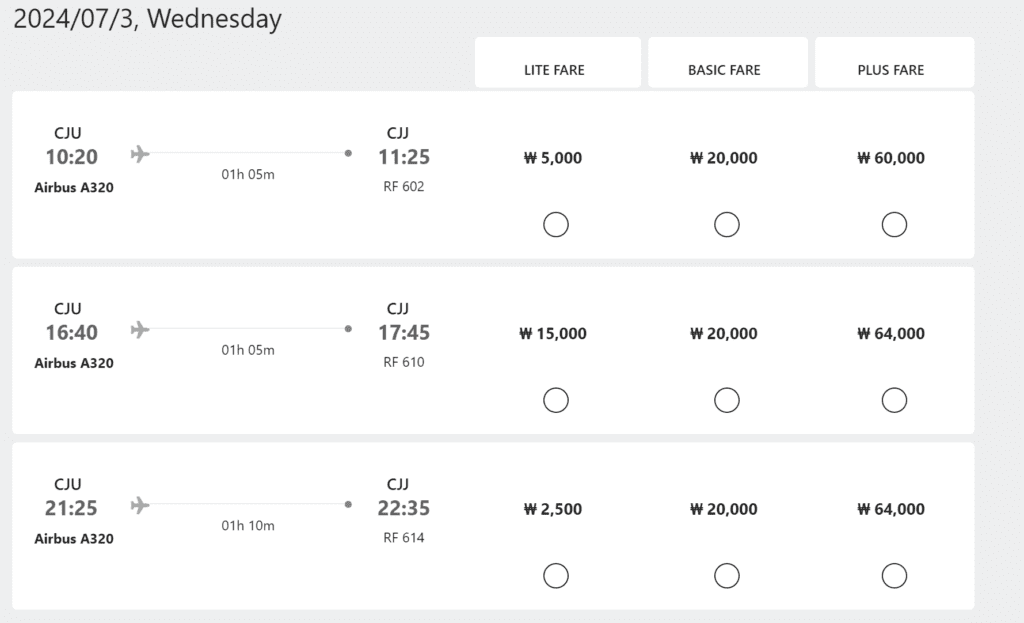 Once I had explored Aero K’s website, I entered all the required information into the flight search engine and was promptly presented with the carrier’s three flights between Jeju and Cheongju that day. These consisted of departures at 1020, 1640 and 2125, and each flight had three fare options: Lite, Basic and Plus. The base fares for these ranged in cost from just 2,500 won (£1.43) up to 64,000 won (£36.74). Seeing as I would not be travelling with any baggage, I went for the cheapest fare and soon taxes and charges were added which brought my ticket up to 21,100 won (£12.12). Whilst this was quite the increase on my base fare, this was still one of the cheapest domestic flights that I have booked in recent times and I was left with no complaints!