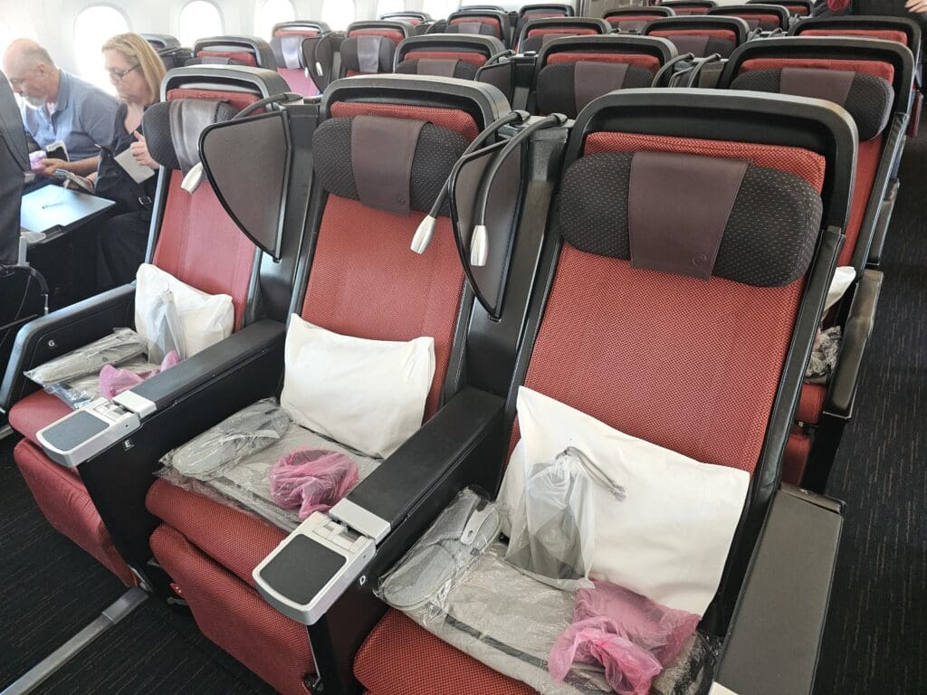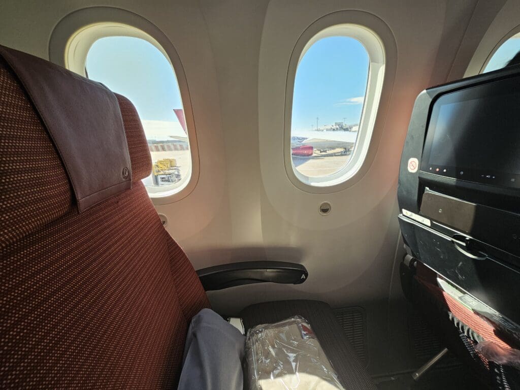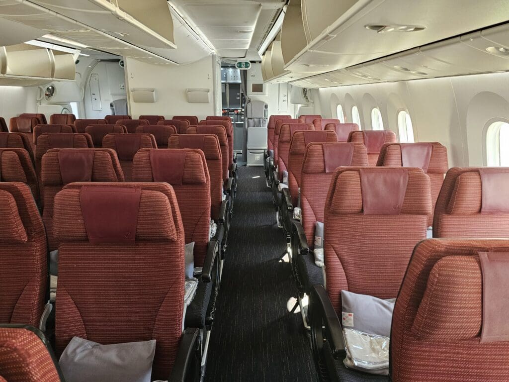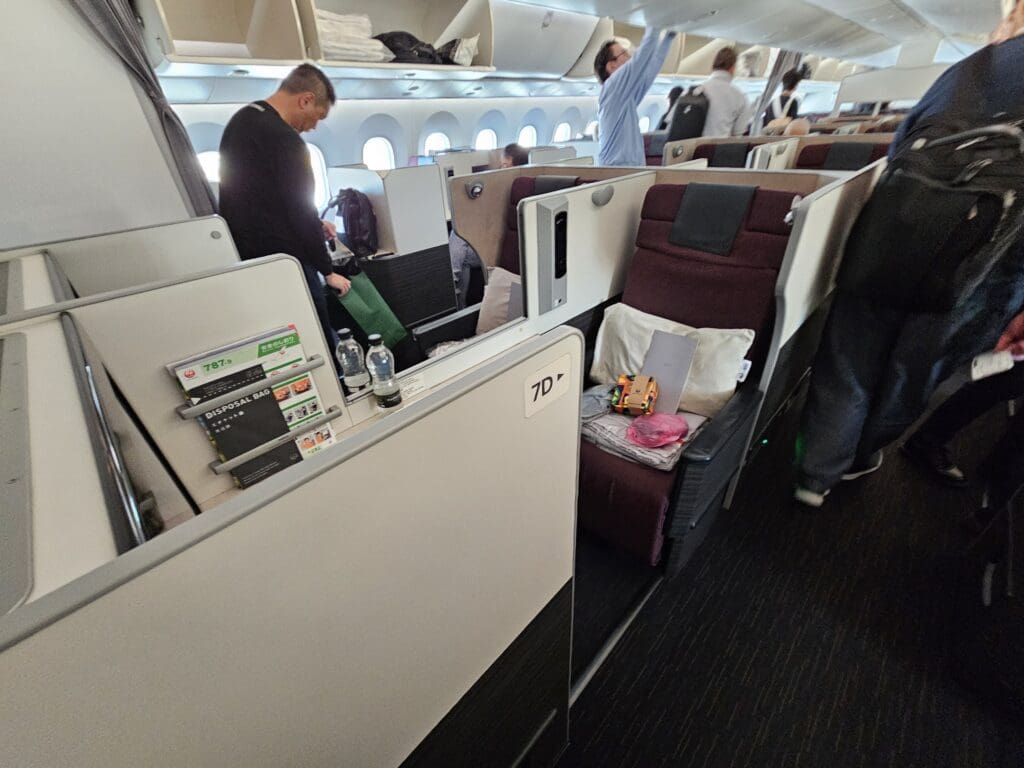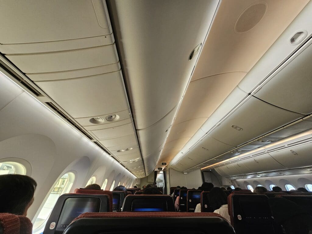 Contrary to the gate agent’s announcement, at 0925 the first cohort of passengers were invited to board the aircraft and the staff soon worked down the boarding order. Seeing as passengers’ boarding passes and passports had been checked at the entrance to the gate holding area, boarding was undertaken on a trust-based system with no further boarding pass checks made. Therefore, dishonest passengers could have attempted to rush onboard as soon as Group 1 was called, however, thankfully this wasn’t the case and boarding was a calm and civilised affair. After around five minutes of lingering around, Group 4 was invited to board and without any further checks, I steamed down the viewless jetway before successfully making it to the Dreamliner’s L2 door. Following a short wait, I stepped into the galley and received a polite greeting in English from the two smartly dressed flight attendants who stood in this galley and welcomed passengers. Within moments, one of the flight attendants checked my boarding pass and instructed me to take a right and head down the first aisle before I commenced the voyage down the aircraft to my seat.