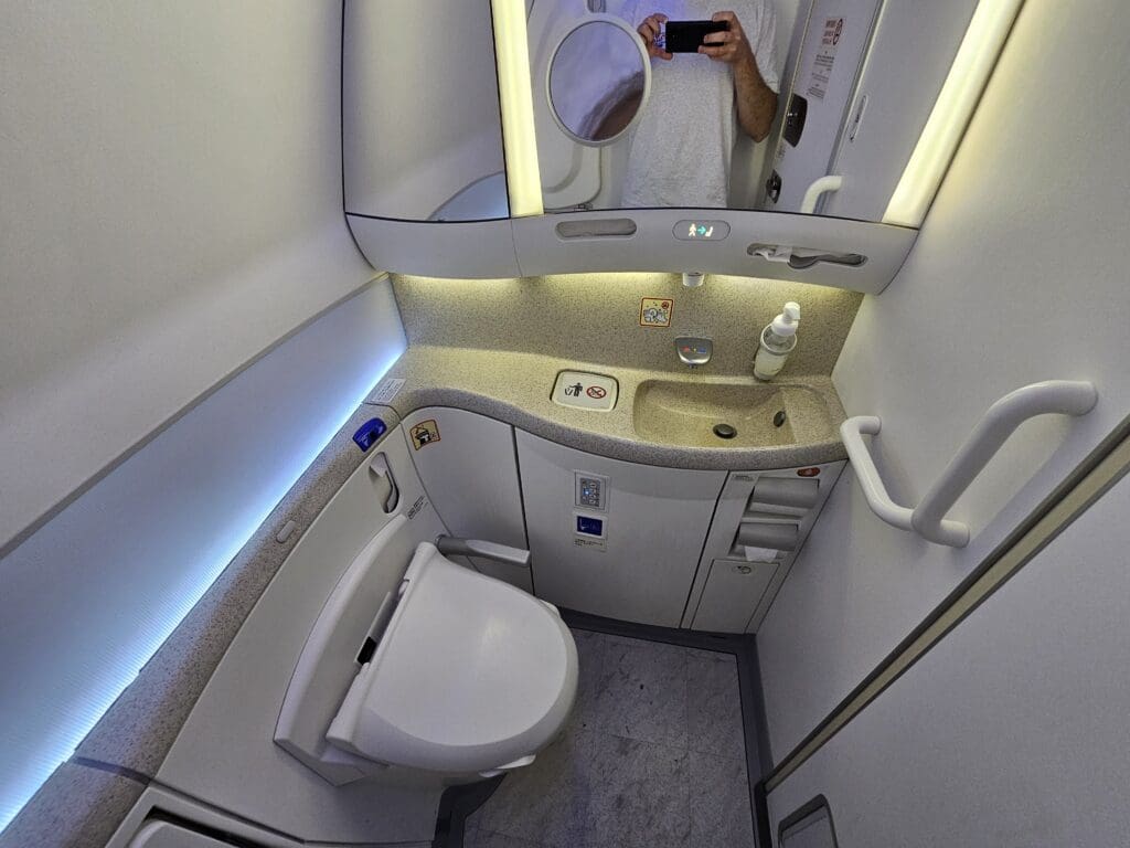 Once the crew had made it through the cabin with the duty free, like many passengers, I took to the aisle and made my way to one of the four lavatories that sit between the Premium Economy and Economy cabins. Shared between the 151 passengers in the two cabins, this equates to 38 passengers per lavatory, which is a fairly middle-of-the-road figure for a widebody aircraft. Following a short wait, I entered the most spacious of the four of these and found this to be in tip-top condition, being both ultra-tidy and largely devoid of any signs of wear and tear. As is the norm on long haul Japanese jets, the toilet also featured a bidet function although admittedly I was unable to strike up the courage to make use of it on the flight that day! My only slight complaint given the length of the flight was that other than a fabric freshener spray, the lavatory was stocked with nothing more than the basics, and it would have been nice if the airline had offered toothbrush-toothpaste sets given the overnight nature of this slog.
