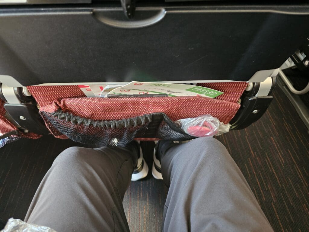 In keeping with Japan Airlines’ brand identity, each Economy seat is covered with a red fabric cover that sports subtle horizontal lines, whilst the seat base is covered by black fabric. These are topped with a decent adjustable headrest that was partially covered by a burgundy pleather antimacassar on which Japan Airlines’ famous motif was embossed. Meanwhile, the rears of these were covered by a black plastic backing which was slightly more unique than your typical light coloured plastic that is seen on most seats. Examining the seats’ features, these came with a seatback pocket, a bi-fold tray table, coat hook and two smaller pockets to hold devices and personal items. The centrepiece of each seat was a high definition 10.6 inch wide touchscreen inflight entertainment screen, powered by Thales’ AVANT inflight entertainment system. Beneath this, a cover could be seen which seemed to be hiding a space that was either once occupied by the inflight entertainment controller, or where this was originally intended to have been installed. Last but not least, a USB port could be found underneath the screen and a universal power outlet was positioned underneath each seat. Using these later on during the flight, I can happily report that both worked without issue, enabling me to charge my phone and laptop.