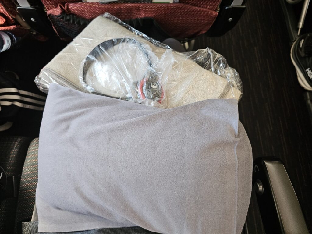Turning to the seatback pocket, this contained the all-important safety card, as well as a sickbag, an information card advertising the onboard wifi, a copy of the latest JALshop catalogue and a copy of the international version of Japan Airlines’ monthly Skyward inflight magazine. Being a long haul flight, expectedly, a set of Japan Airlines branded headphones, a packaged blanket and a pillow were all provided. These all seemed to be of above-average quality when compared to the usual Economy class offerings and thus left me with zero complaints. My only slight gripe was that despite the long length of the overnight slog to Tokyo and Japan Airlines’ stellar reputation, nothing by means of an amenity kit was offered. However, perhaps my amenity kit expectations had been skewed, having recently been provided with no fewer than two of these on the five-hour hop from Baku to London with Azerbaijan Airlines!