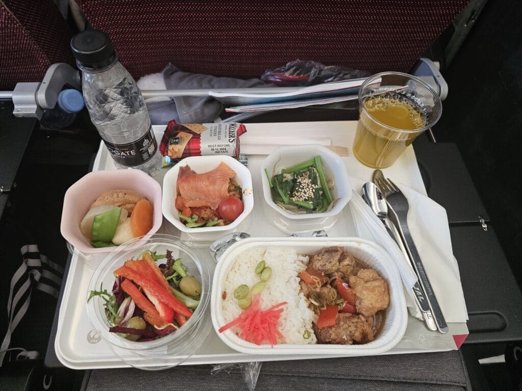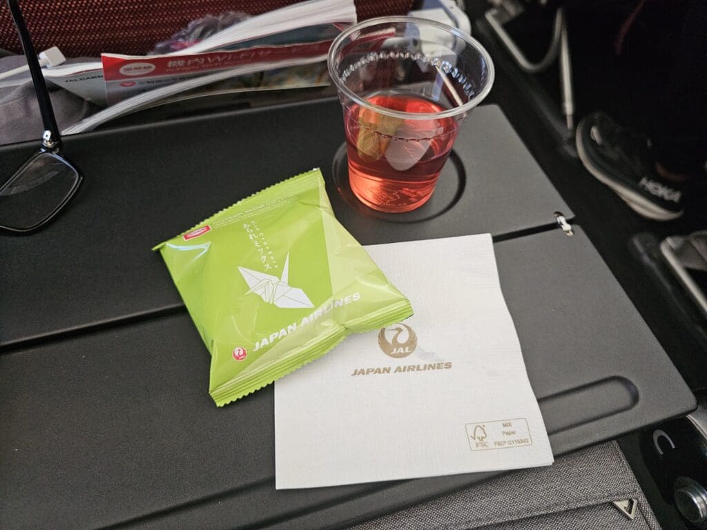 In the usual manner, lunch, or rather brunch, was to be preceded by a round of drinks. Once this began, this seemed to take place at a slower-than-usual pace. However, I soon discovered that this was due to the fact that passengers were handed a menu and given a few moments to glance over this, before stating their drink choice and handing back the menu which would then be passed onto those in the next row. Much to my delight, an impressively expansive range of hot and cold, hard and soft beverages were available. Upon reaching my row, I opted for a cup of Japan Airlines’ signature Sky Time peach and grape juice, which I paired with a black coffee from the airline’s JAL Café. Whilst I found the flight attendant to be pleasant and friendly, they did end up accidentally forgetting to give me a snack along with this. However, upon requesting this, they were very apologetic and soon handed me a packet of Japan Airlines branded rice crackers and a serviette. When it came to the quality of the beverages, the juice was refreshing, although it was, well, juice! Although I do have to say that the coffee did seem to be a cut above your usual gloopy inflight coffee offering.