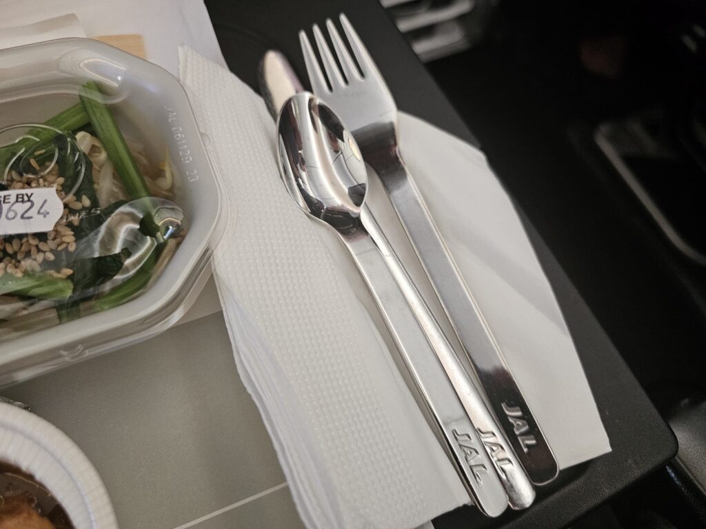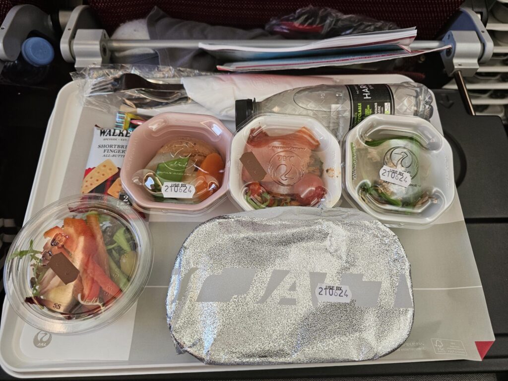 For those who, like myself, had been looking forward to Japan Airlines’ veritable inflight cuisine since booking, Japan Airlines publishes the inflight menu for each of its services several months in advance on its website. Thus, despite pretending to show interest in the menu card, I was in fact already well aware of that day’s choices! As on most Japan Airlines medium and long haul services, passengers were given the option of a Japanese (chicken with grated radish sauce and steamed rice) or Western (beef meatballs with cream sauce) meal. Both of which were accompanied by sides of salmon and ratatouille, spinach and bean sprout namul, simmered vegetables and a small side salad with a sachet of Italian dressing. This also came with a packet of Walkers’ shortbread and a 250ml bottle of Harrogate Spring Water, whilst eating utensils were provided in the form of real metal cutlery and disposable wooden chopsticks.