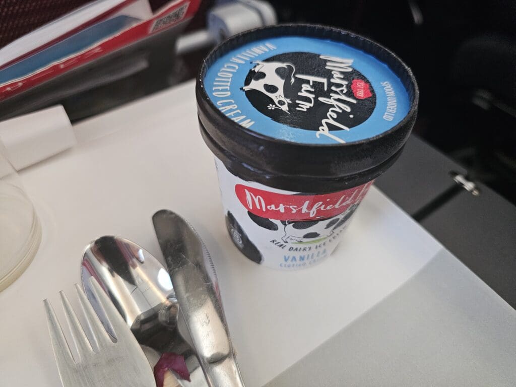 Seeing as I was flying aboard Japan Airlines, it would have been sacrilege not to go for the Japanese option! Without hesitation, I opted for the chicken and a large tray was soon cautiously placed on my tray table. Whilst I was tempted to pair this with the plum wine, cautious of drinking on such a long sector as I wished to conserve as much energy as possible, I instead paired this with a simple cup of cold green tea. As inflight meals go, I have to say that this lunch was most definitely one of the more high-quality meals that I have had the pleasure of eating. Not only was this delicious and comparatively healthy but I was left with nothing to complain about when it came to the portion size and found the meal to be sufficiently filling. Almost as soon as I had vacuumed up everything that was on my tray, a flight attendant appeared and began handing out small tubs of rock-solid vanilla ice cream, before several crew members passed through the cabin distributing hot green tea and coffee.