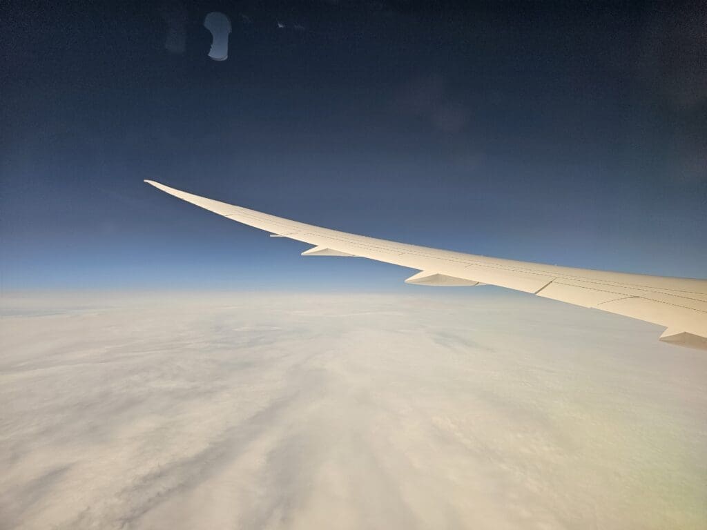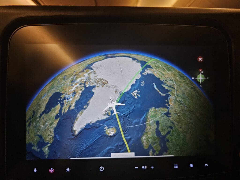 Returning to the route, around two hours into the flight, the aircraft crossed into the Arctic Circle and sped towards the coastline of Greenland. Almost three hours into the flight, the Dreamliner reached the southern shores of Greenland’s Clavering Island and we continued heading northwards over the world’s largest national park, Kalaallit Nunaanni nuna eqqissisimatitaq. After an hour-long nap, I woke up to find that we were, unsurprisingly, still over the national park. Now wide awake, I decided to grab a drink from the galley. Once there, I was greeted by a very polite and friendly flight attendant who soon poured me my drink of choice. In addition, I requested some Japan Airlines postcards, and after jotting down my seat number, the friendly flight attendant soon reappeared with three postcards featuring the airline’s latest addition, the Airbus A350-1000.