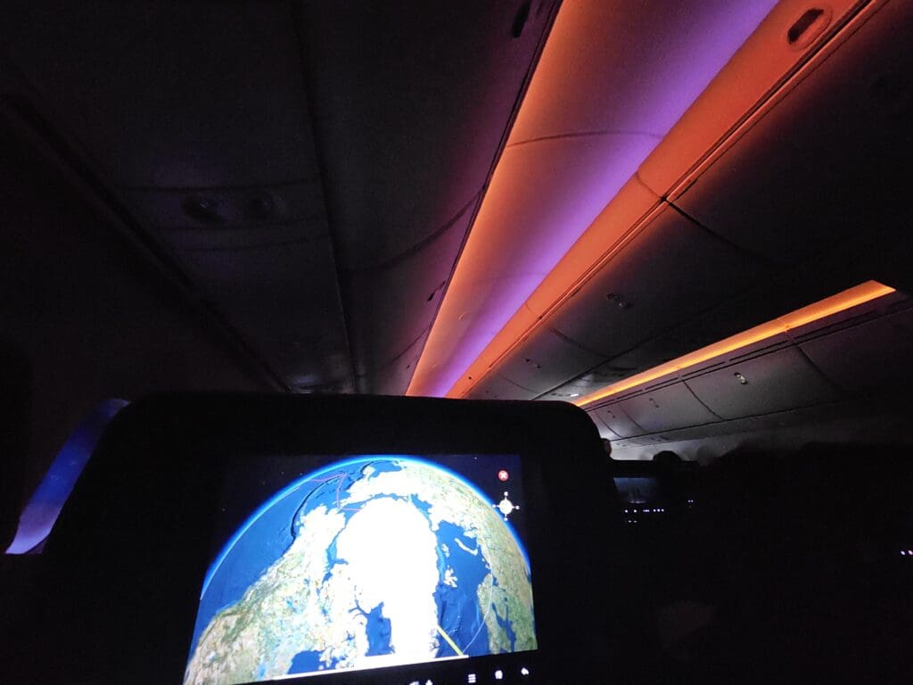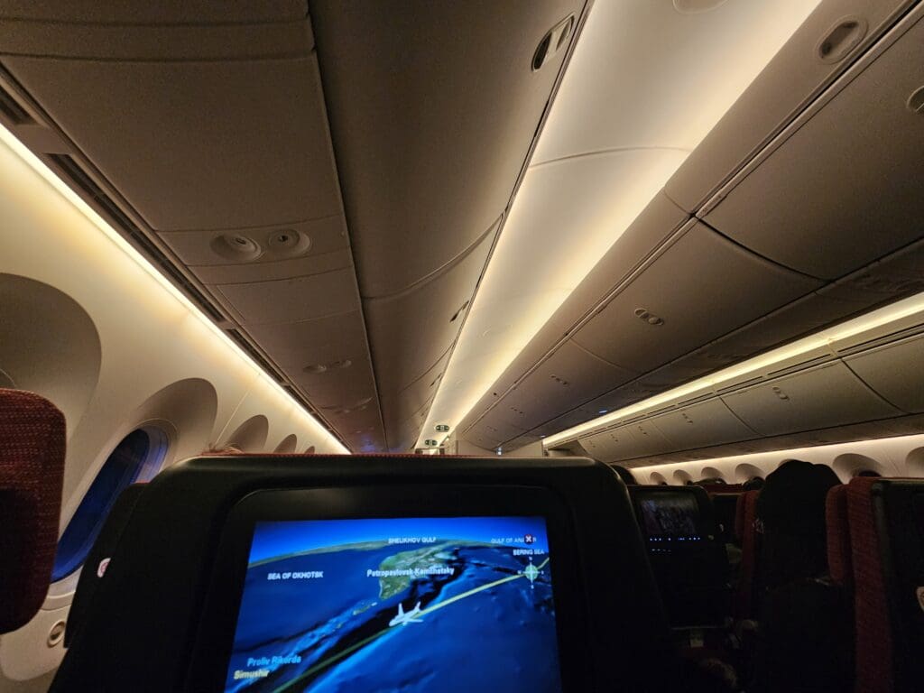 Continuing southwards over the Pacific Ocean, it wasn’t long before I was filled with excitement as we sped towards the International Date Line. Before I knew it, I made my first crossing of this, with the local time magically shifting from a Thursday morning to a Friday morning as we accelerated into the future at a rate that rivalled the DeLorean. After the excitement of this, I drifted back off into a light sleep for a couple of hours, waking up every thirty minutes or so. By the time I awoke for good, the aircraft was around four hundred kilometres south of Petropavlovsk-Kamchatsky, and heading southwestwards parallel to Far Eastern Russia’s Kuril Islands. With a little under three hours to run until our arrival, by this time, I was feeling a little restless and was simply watching the clock go by, eagerly awaiting our arrival! At this time, I decided to make another lavatory trip and I was delighted to find that this remained in a spotlessly clean condition, indicating that this had been tended to regularly throughout the service.