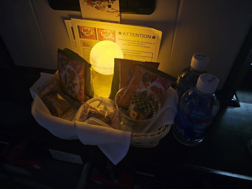 As the aircraft cruised high above the North Atlantic, with nighttime having arrived in Japan, the cabin lights were dimmed to a faint dusk orange glow before being turned off completely bar from a strip of orange and purple above the overhead lockers. Accompanying this, the window shades were dimmed to their darkest setting. At this time, the cabin crew set up a snack basket in the galley between Economy and Premium Economy. This contained biscuits, small squares of both milk and dark chocolates as well as salted snacks. For most of the flight, there seemed to be a flight attendant on duty guarding this basket and providing a drink to those who requested one. In addition, the flight attendants regularly patrolled the aisles throughout the flight, making frequent passes to distribute cups of still and sparkling water to thirsty passengers.