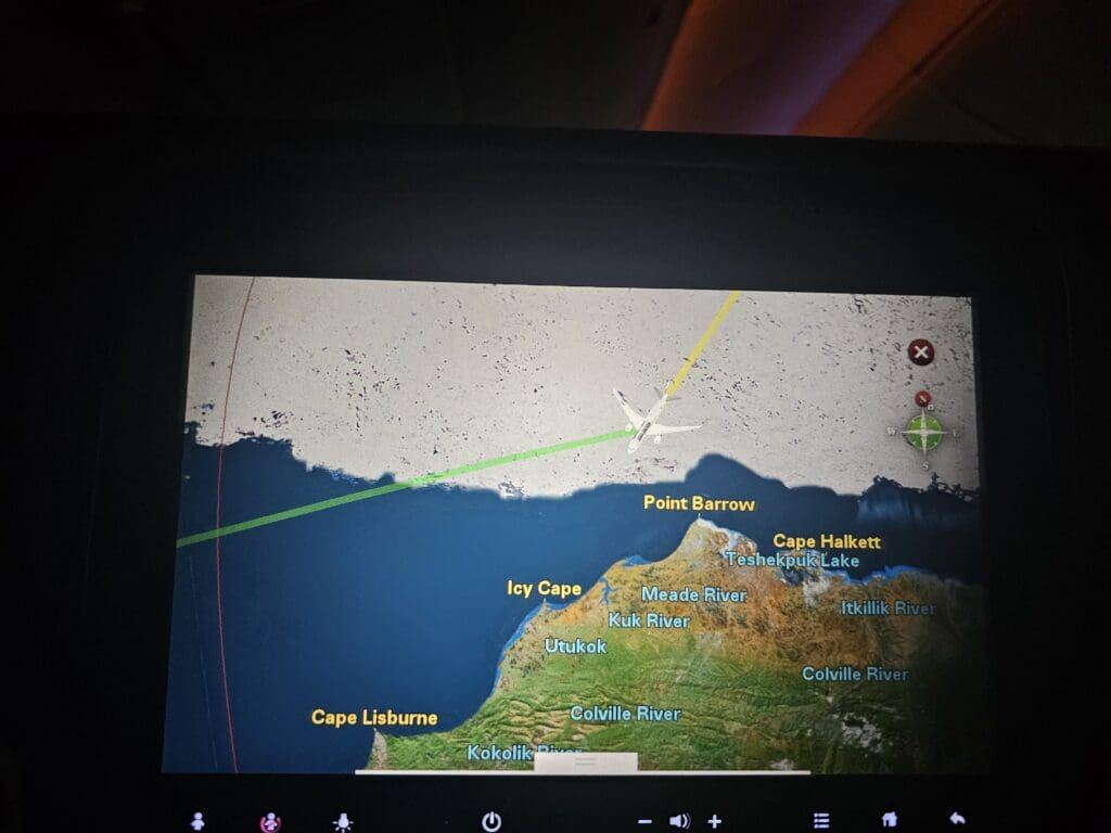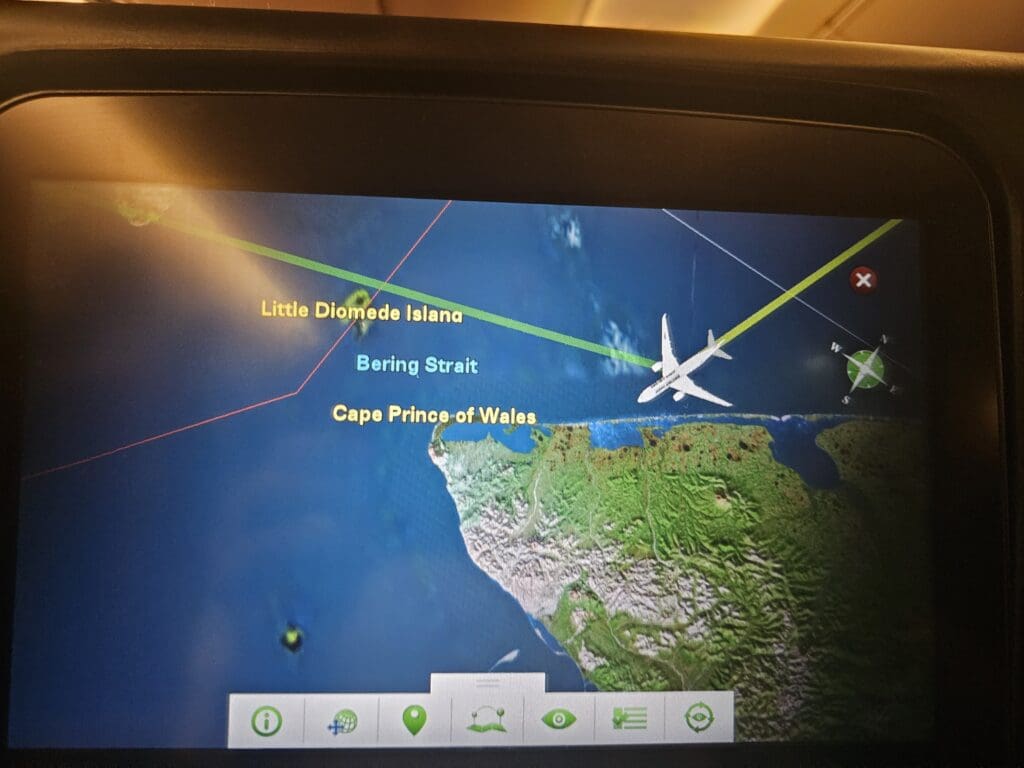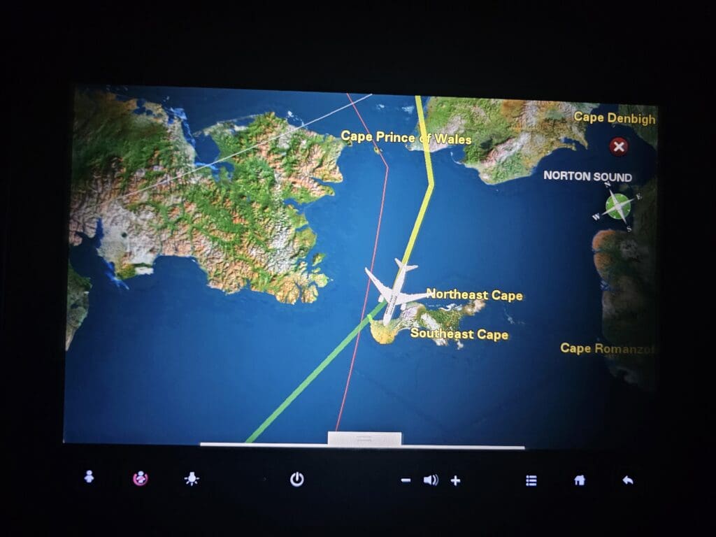 A little over two hours after leaving Canada’s Ellesmere Island behind, the Dreamliner made landfall over the remote northern coastline of the Alaskan borough of North Slope. A minute or so later, we passed high above the settlement of Point Lay, home to over three hundred residents and connected to the outside world by a small airport. This is served by Fairbanks-based Wright Air Service. From there, the Dreamliner continued heading down over the far western fringes of Alaska and the most remote reaches of the United States. After crossing the Kotzebue Sound, the aircraft reached the Seward Peninsula and made its way over the Cape Prince of Wales, the peninsula’s western tip and the westernmost point of the Americas! Near the tip of this is North America’s westernmost city, Wales. Named after the country, today, this can hardly be described as a sprawling metropolis and as per 2020 statistics, this was home to fewer than 170 residents!  Passing just to the east of the city, the Dreamliner took about four minutes to cross the peninsula from north to south, and after passing directly overhead the former mining settlement of York, the Dreamliner headed out over the frigid waters of the Bering Sea.