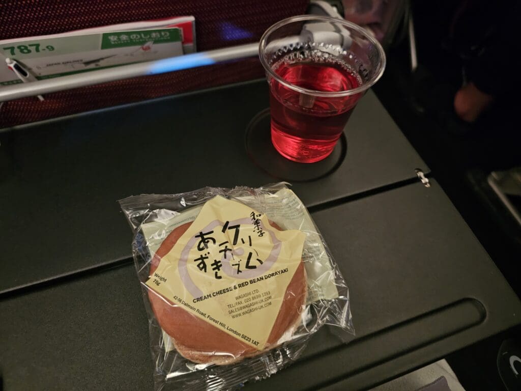At 1800 in the UK, or 0200 in Japan, as we neared the northern coastline of Alaska, the cabin lights transformed into their sunrise orange glow and the crew soon took to the aisles indicating that the mid-flight snack service was soon to commence. A short time later, the same JAL Business Class packaged wet wipes were distributed before the crew rolled out the service carts into the aisles. Upon reaching my row, a cream cheese and red bean-filled dorayaki was placed on my tray table which I opted to pair with another cup of Japan Airlines’  Sky Time juice. Having been snacking in the galley, I was not overly peckish at this time, however, this mid-flight dorayaki most certainly left me with nothing to complain about. After this, two rounds of hot green tea were made before the rubbish was collected and the lights were dimmed once again.