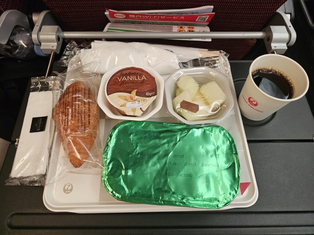 At 0510, the carts were rolled out into the aisles and around ten minutes later, another polite and friendly flight attendant placed the meal onto my tray table. When it came to drinks, tempted by a third and final Sky Time juice, I instead went for a JAL Café black coffee before getting to work on the breakfast offering. Whilst compact, with the exception of the croissant, this was of very good quality and was most certainly adequate given the length of the flight. Once all meals had been handed out, several crew members then passed through the cabin distributing hot coffee and green tea, before returning to collect the empty trays about twenty minutes later. Afterwards, the crew made a final pass through the cabin offering duty free sales, appearing to have much less luck this time around when compared to their first sales round several hours earlier.