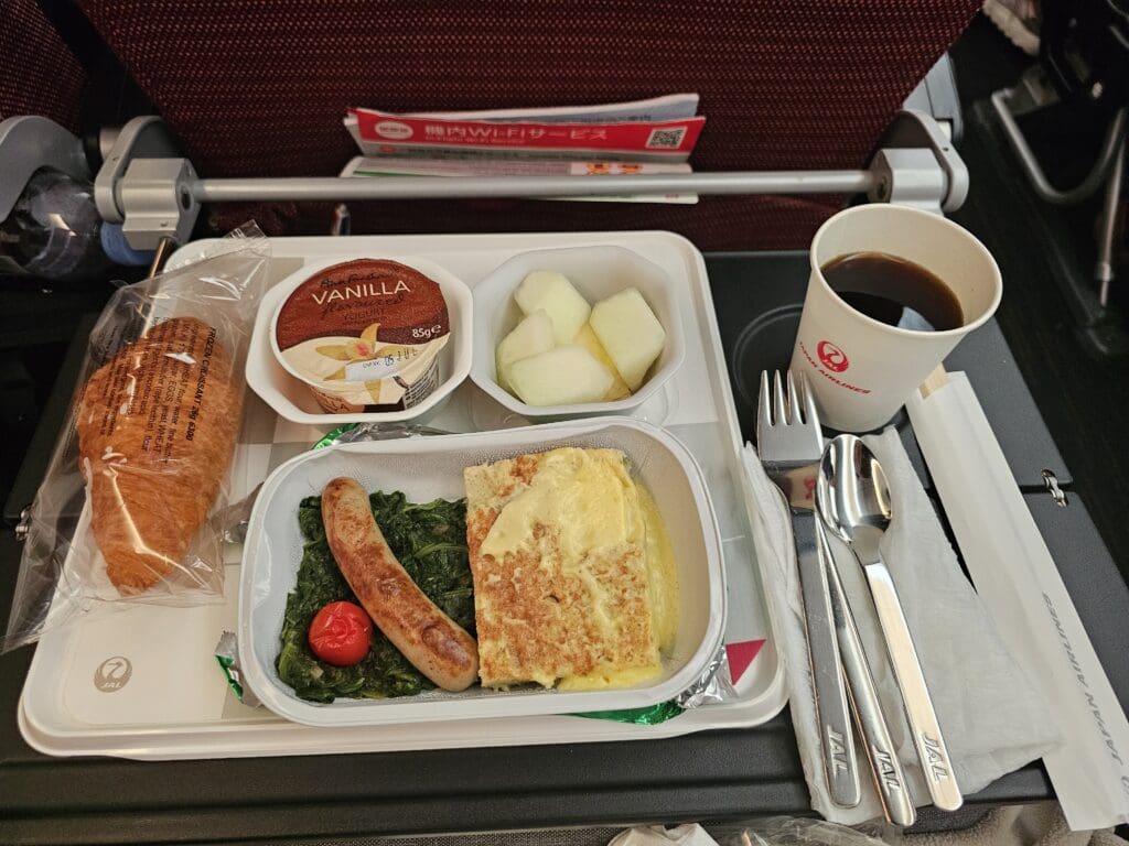 Following several hours in darkness, at 0455 Japan Standard Time, the lights were turned onto their sunrise orange glow and soon the scent of warming food wafted through the cabin. Whilst it was almost 2200 on Thursday evening in London, given our morning arrival into Tokyo, it was only appropriate for the flight’s second meal service to take the form of breakfast. Having studied the menu online before departure, that morning, I was already aware that just a single option would be offered. This came in the form of mushroom frittata with Hollandaise sauce, accompanied by a turkey sausage and paired with a yoghurt, fruit salad, and a typically Economy quality croissant that would have struck disgust into the heart of any French national!  This was accompanied by metal cutlery, a packaged JAL Business Class wet wipe and a set of disposable wooden chopsticks.
