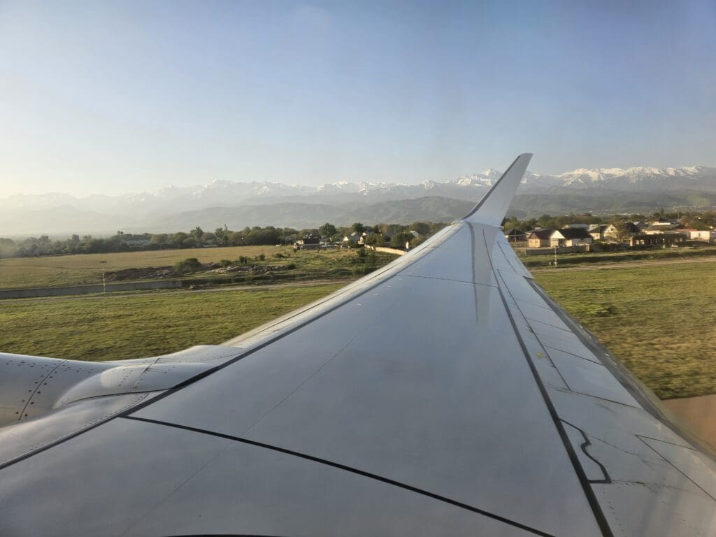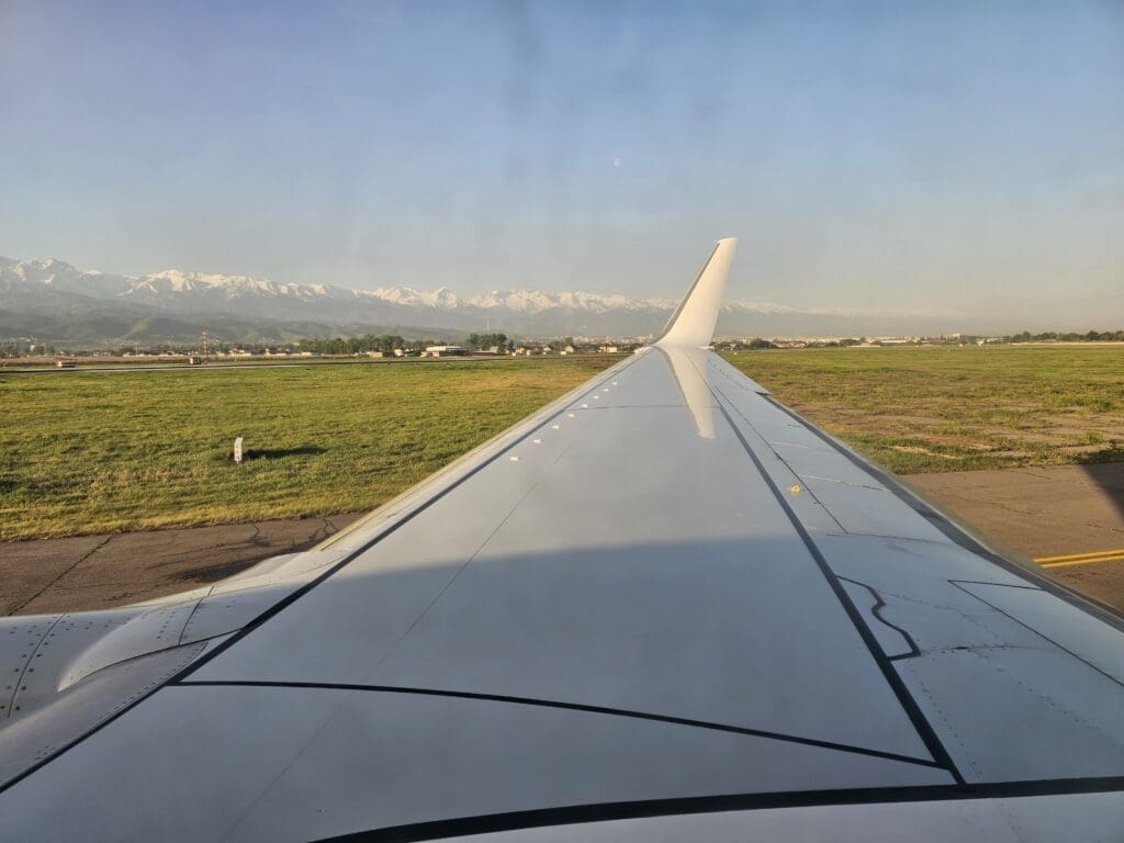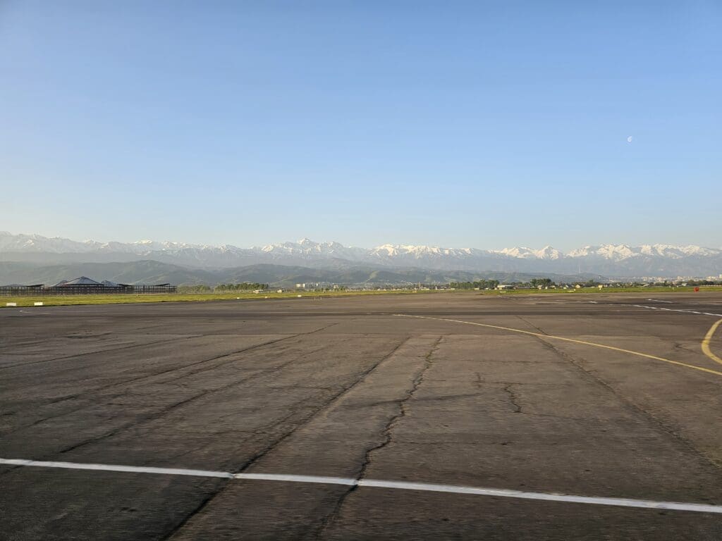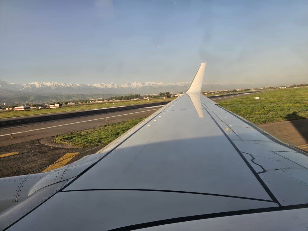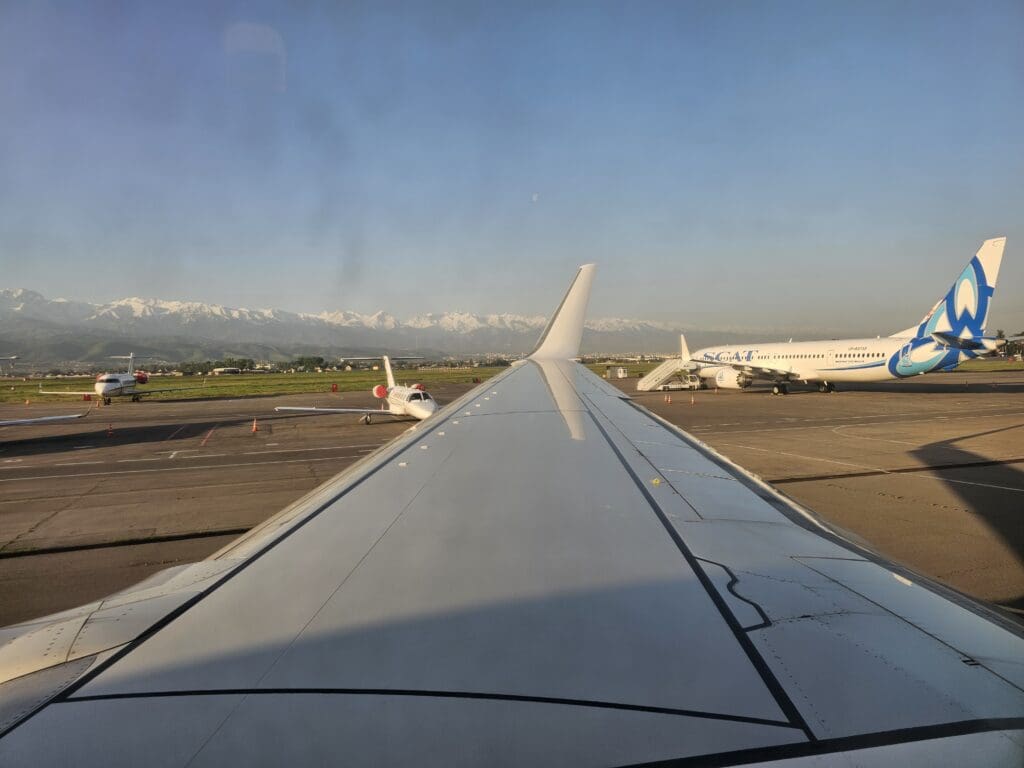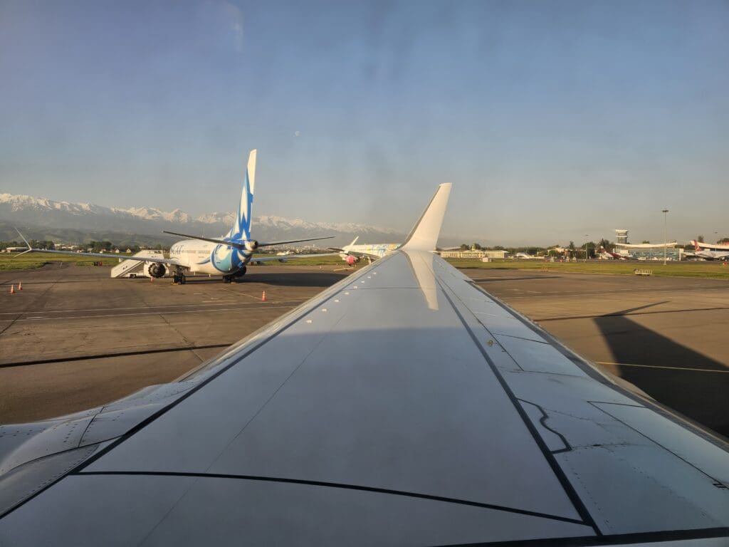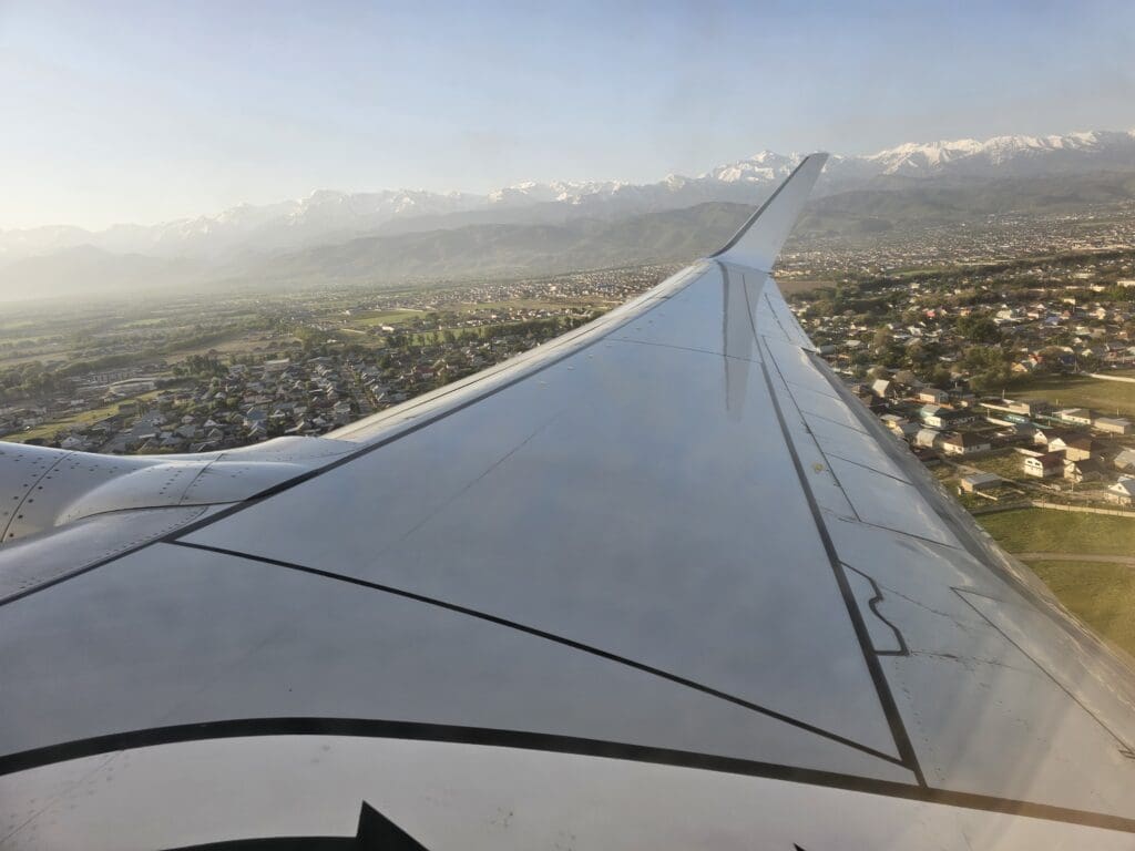 Once there, without pausing the Boeing began rolling down the runway. Likely to be heavily laden with fuel, that morning our takeoff roll was long and gentle, and we did not seem to take to the skies until we neared the end of the runway. Reassuringly, eventually, we rotated upwards into the Kazakhstani skies and made a fairly gentle climb. Thanks to the lack of haze and sitting on the right-hand side of the aircraft, I was treated to a good view of the tall snow-capped peaks of the Tian Shan Mountains before the Boeing banked to the left and rolled out on a westerly heading.