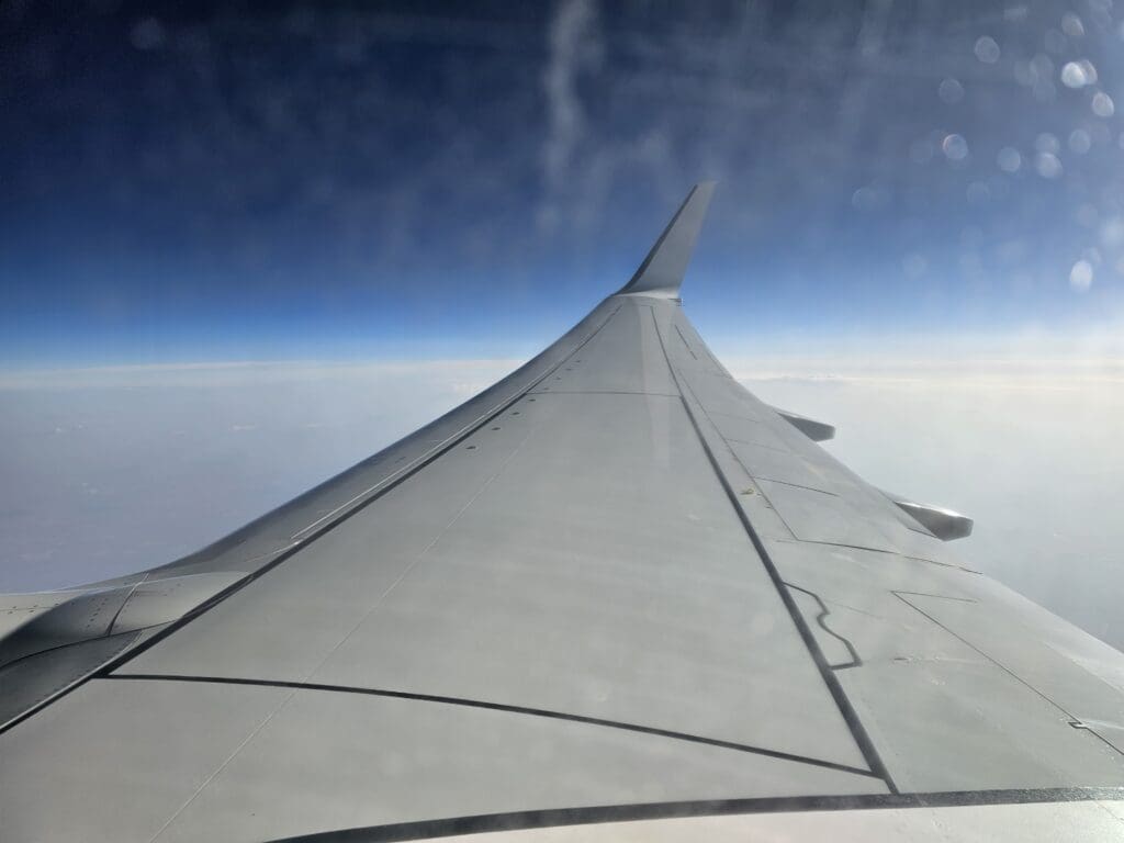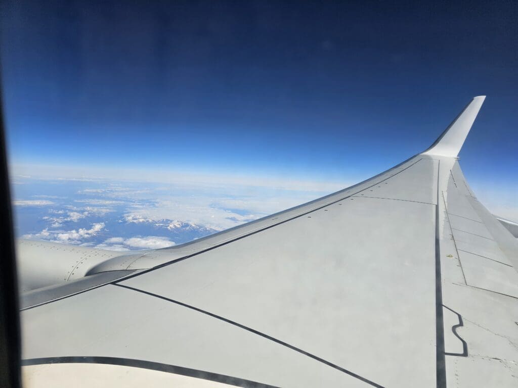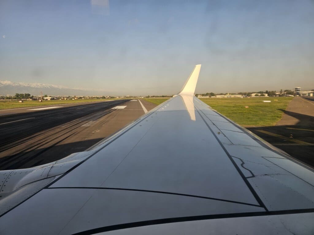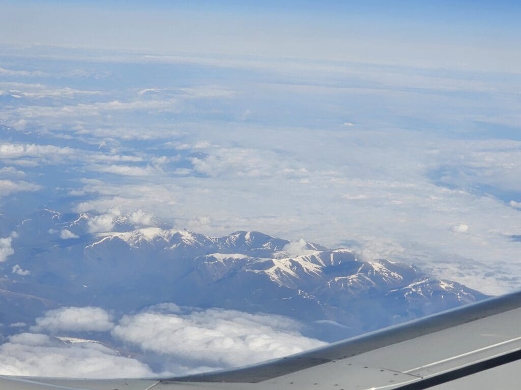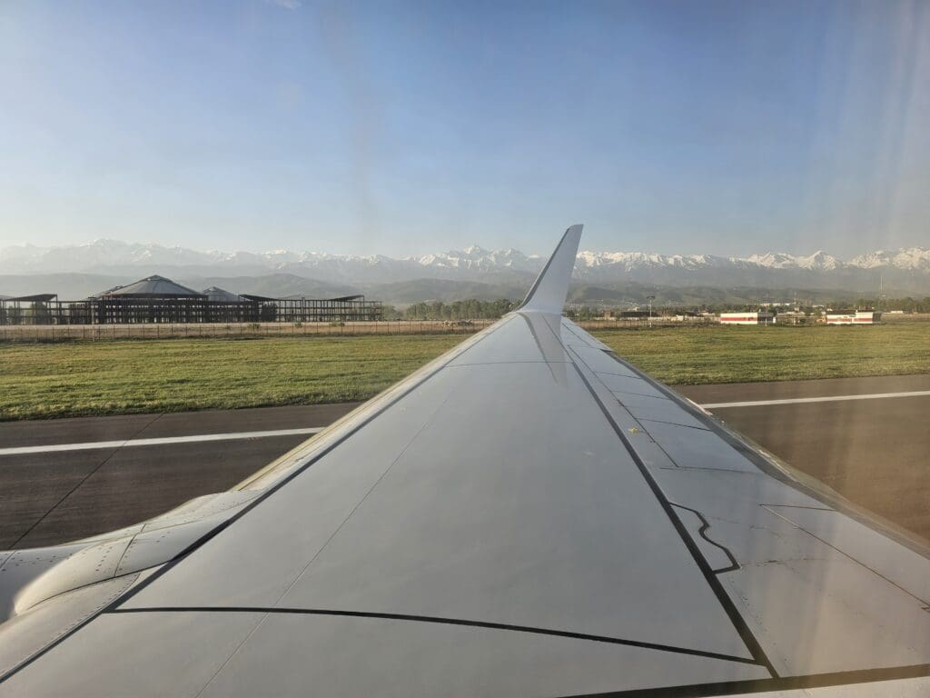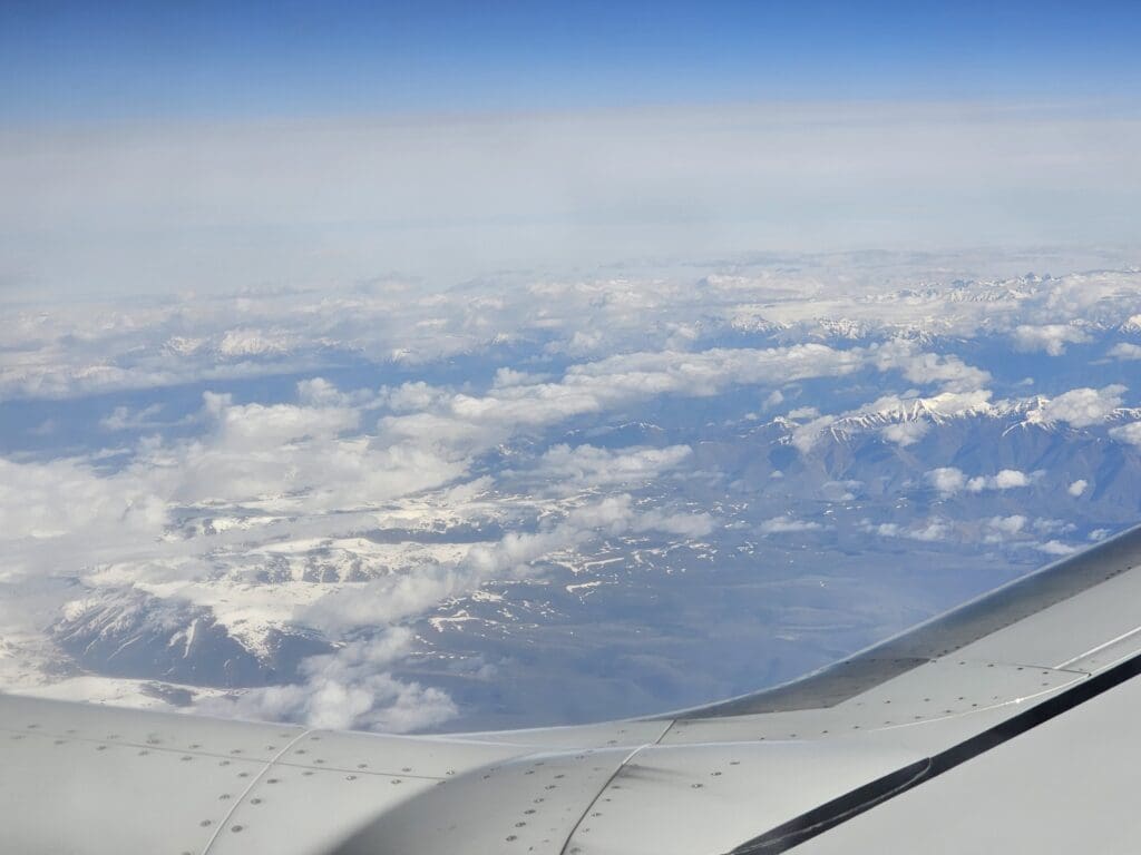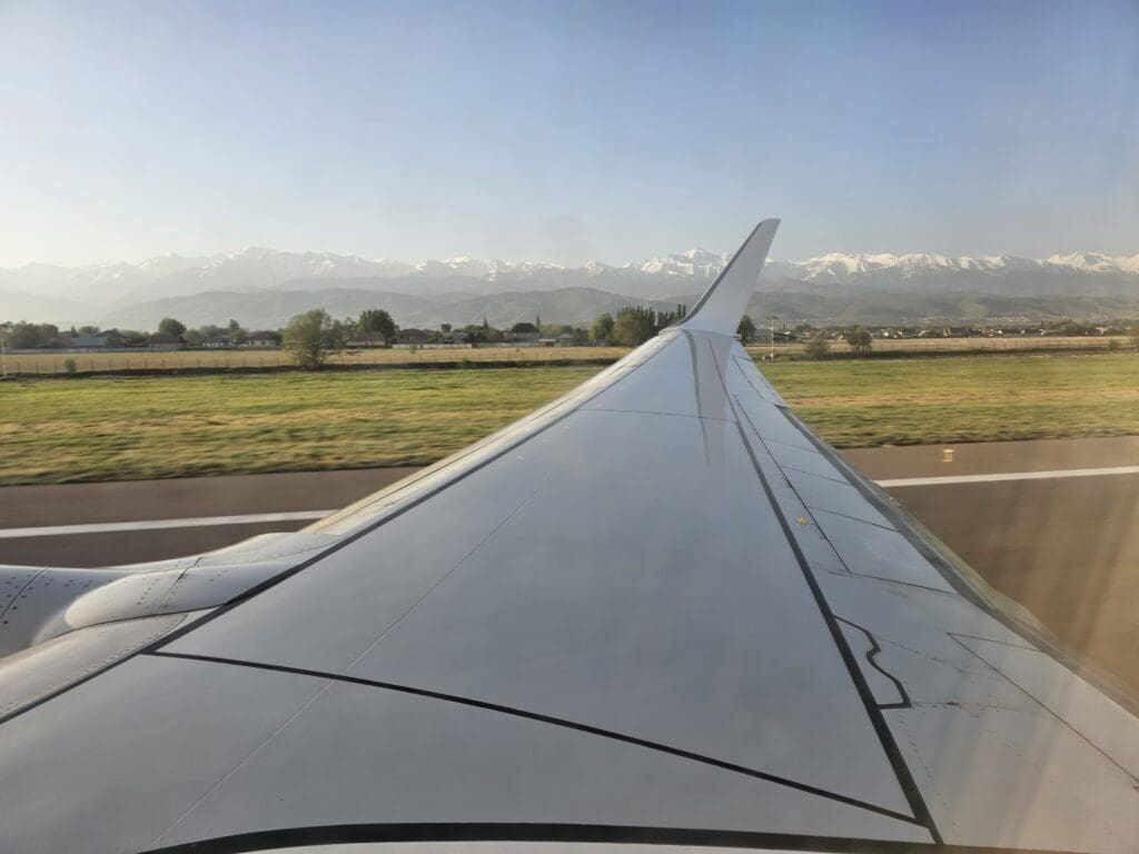 Once there, without pausing the Boeing began rolling down the runway. Likely to be heavily laden with fuel, that morning our takeoff roll was long and gentle, and we did not seem to take to the skies until we neared the end of the runway. Reassuringly, eventually, we rotated upwards into the Kazakhstani skies and made a fairly gentle climb. Thanks to the lack of haze and sitting on the right-hand side of the aircraft, I was treated to a good view of the tall snow-capped peaks of the Tian Shan Mountains before the Boeing banked to the left and rolled out on a westerly heading.