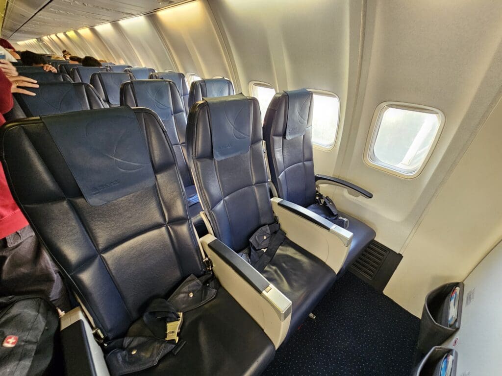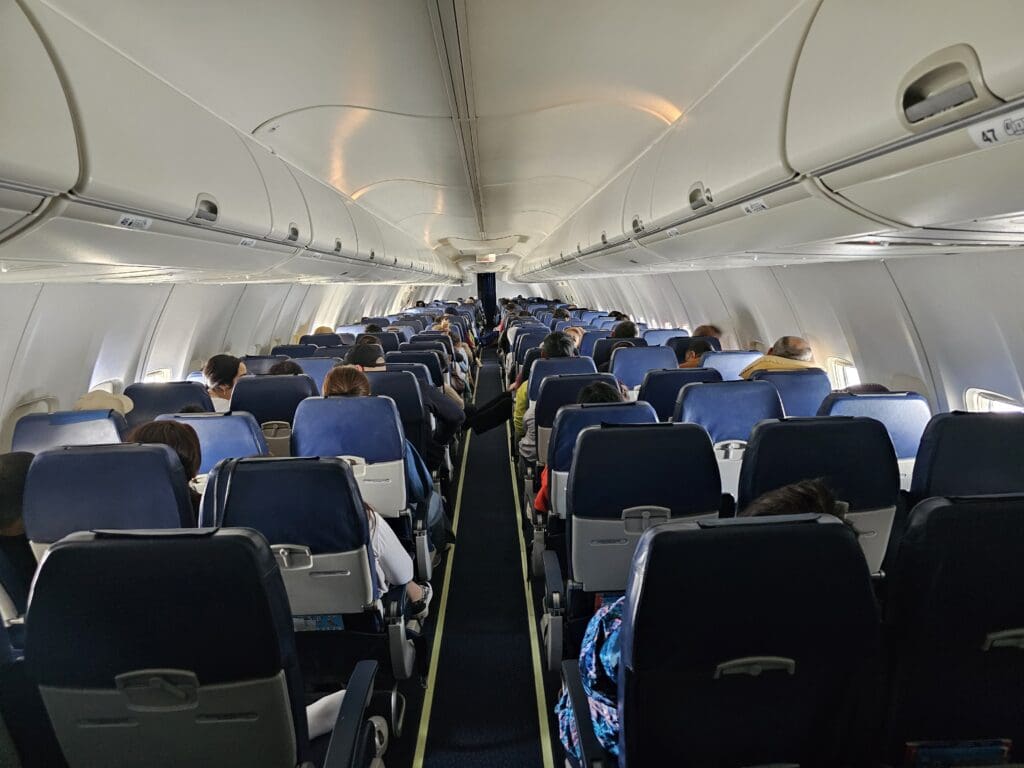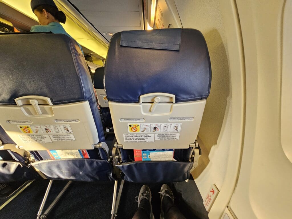 After a few minutes of waiting, I stepped into the Boeing’s forward galley where I was greeted in Russian by one of the six flight attendants on board – all of whom were donned in SCAT Airlines’ very distinctive vibrant green-turquoise uniform. Turning right, I entered the aircraft’s all-economy cabin which is home to a total of 189 seats – the standard number on a low-cost carrier-operated Boeing 737-800. Onboard, each seat came in the form of a retrofitted modern, thin and firm-looking seat covered in a dark blue pleather cover and topped with a blue leather headrest cover on which SCAT Airlines’ motif was debossed. As I made my way down the cabin, calming piano music rang out and provided a pleasant soundtrack to the otherwise slightly chaotic boarding process as passengers tried to pile onto the aircraft as quickly as possible.