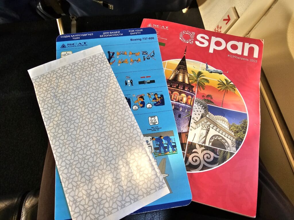 As I made my way to Row 31, I received another greeting in Russian from a smiling flight attendant before arriving at my seat. Travelling in an emergency exit row, I decanted everything I would need for the flight and stowed my bag in the overhead locker before settling in for the journey ahead. As I had expected given their appearance, I found the seat to be firm although the superb legroom offered in this emergency exit row seat made up for this. Examining the area around my seat, I was pleased to find this to be in good condition with no obvious wear and tear, whilst the cabin appeared to be in a clean and spotless condition. This was most definitely a far cry from the vintage SCAT Airlines Boeing 737-500 I had flown from Xi’an to Almaty back in August 2017! Examining the contents of the seatback pocket, this contained a safety card, sickbag and a pristine copy of the April 2023 issue of SCAT Airlines’ Aspan inflight magazine.