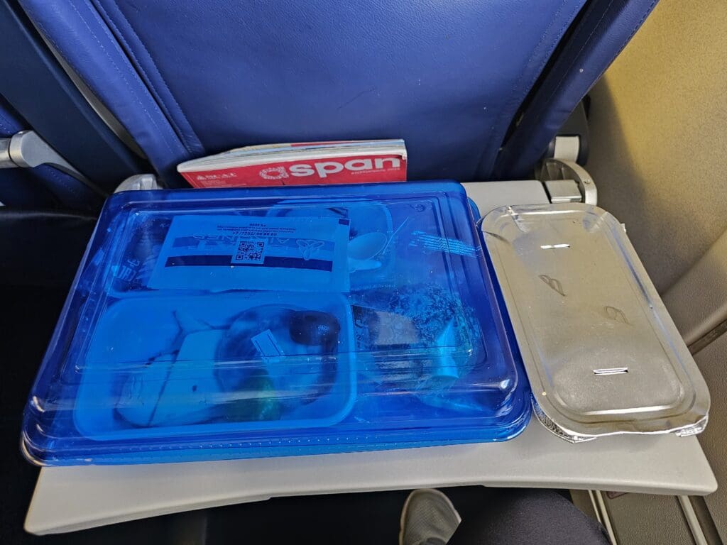 At 0812, the Purser performed a trilingual announcement advising that the meal service was about to commence and requested passengers to ensure that their seats were in the upright position for this. A short time later, two carts were rolled out into the aisle, with one commencing service from the front of the aircraft and the other from the emergency exits. Soon reaching my row, I was handed a plastic box which seemed to be heavily laden with food (although not to Uzbekistan Airways quantities!) and I was then offered a choice of beef or chicken. Opting for the former, a boiling hot foil dish was passed over to me which contained a beef and pasta dish, meanwhile, the box contained a bread roll, cold cuts of meat, a small salad and dressing and a carrot cake along with plastic cutlery. A choice of four drinks – Coca Cola, coffee, tea and water were offered and I opted for a coffee which was soon passed to me in a paper cup. Whilst far from being haute cuisine and not the most traditional of breakfast foods, overall this meal was certainly filling and was by no means inedible.