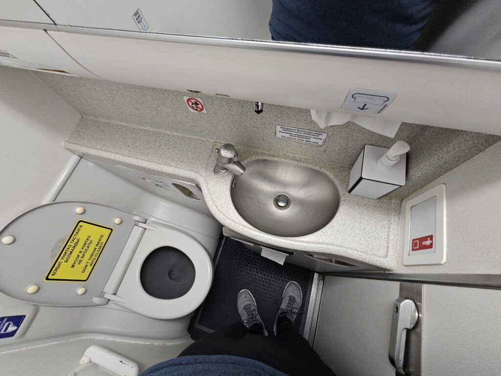 Around thirty minutes after the service had commenced, the remnants of the meal were collected and the cabin fell back to sleep. Returning to the route, by this time, the aircraft was cutting across Kyzylorda Region and speeding towards the Aral Sea. After passing over this, the aircraft turned to fly southwest as it skirted around the far northwestern Uzbek border without entering the country’s airspace. From there, the aircraft made a beeline for Kazakhstan’s Caspian Sea coastline and crossed over this just to the south of the city of Aktau, a total of almost exactly three hours after taking to the skies. As we crossed the Caspian Sea, I decided to make a trip to one of the two lavatories at the rear of the aircraft. As I neared these, I noticed that the rearmost rows of the jet were being used as crew rest areas, with two crew members on either side sprawled out and fast asleep. This gave the impression that despite the length of the flight, the crew would be heading back to Kazakhstan later that day. Upon entering the lavatory, I was pleased to find this to be clean and in good condition, leaving me with nothing to complain about.