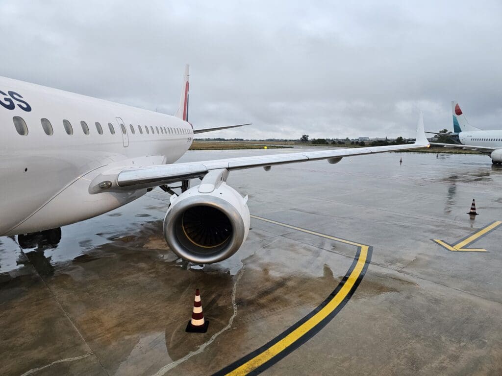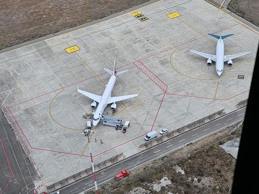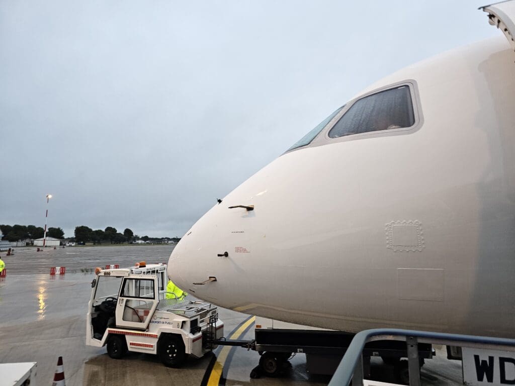 After leaving the terminal, I made the short walk over to Stand 2, where Lumiwings’ latest addition, Embraer ERJ-195LR, SX-LWD, could be seen standing next to the Boeing 737-300 that it had replaced. Manufactured at Embraer’s plant in São José dos Campos, not too far from the city of São Paulo, this aircraft first took to the skies in Autumn 2010 making it thirteen years old at the time of my flight. Destined for Brazilian carrier Azul, this aircraft did not have far to go on delivery and it spent the next ten years there, shuttling passengers primarily across the country where it sported the registration PR-AYO and name Rosa e Azul, and wore the airline’s Pink Ribbon livery. With the onset of the pandemic in 2020 and the drop in passenger demand, the aircraft took on a new role as a preighter aircraft and was repainted into Azul Cargo colours and renamed ‘Full Cargo’. Flying cargo for around two years, in August 2022 the Embraer was withdrawn from service and entered storage, initially in Campesinas before being ferried to Sorocaba. In August 2023, the aircraft returned to its birthplace and spent a month on the ground where I assume it was readied for its return to passenger service. Whilst retaining its Azul Cargo colours, it was given the American registration of its lessor Azorra Aviation, N391AZ. At the end of August 2023, the aircraft was ferried across the Atlantic to one of my local airports, East Midlands, where it was repainted into the colours of Lumiwings, and given the name Kefalonia and its current registration before being shuttled to Athens in early October 2023, and then onwards to Foggia. Having entered service just four days before my flight, this was to be the aircraft’s fifteenth revenue flight with Lumiwings!