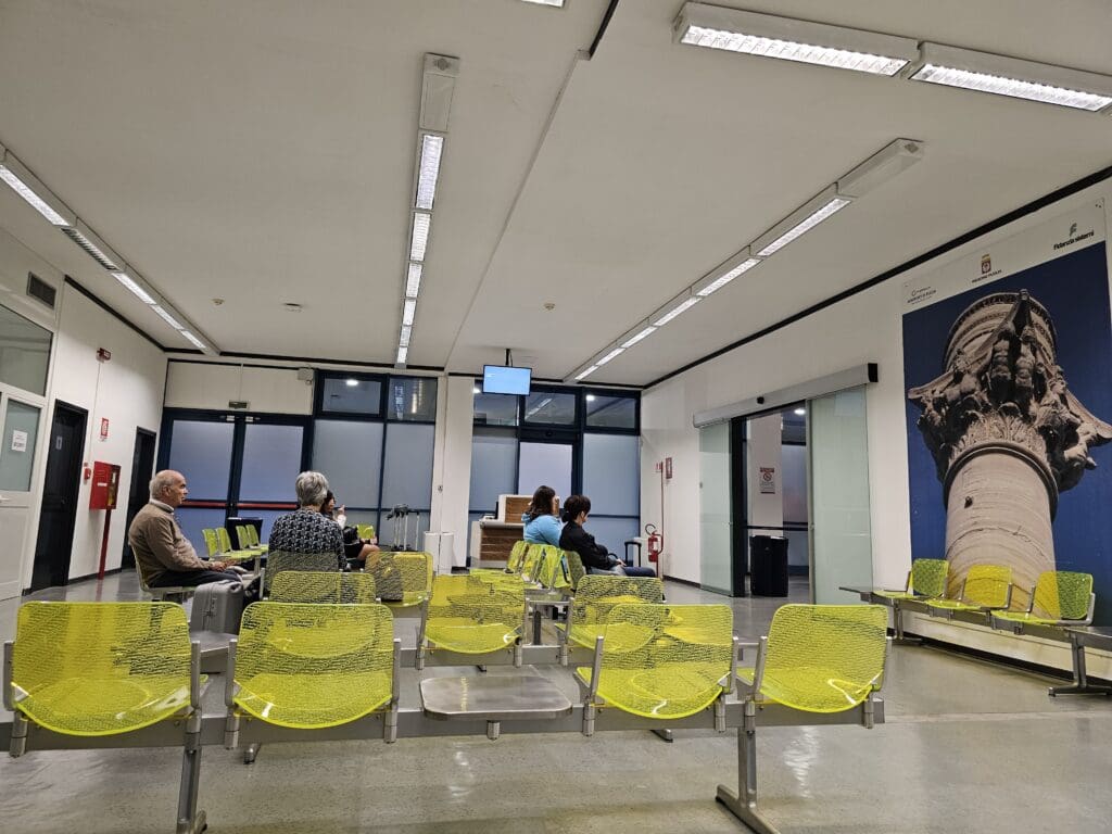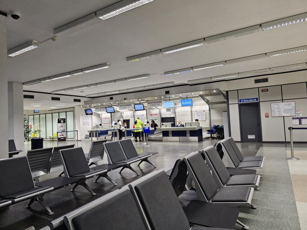 Eager to get inside, I rushed towards Foggia Airport’s small terminal building and with an hour and twenty minutes to go until departure, I found myself standing in the small check-in hall. At that time, this was completely devoid of passengers although an army of staff, most of whom sported Aeroporti de Foggia’s smart mostly red uniform could be seen ready and raring to assist passengers. Seeing as I was now completely drenched, my first port of call was the bathrooms where I changed into the now partially damp clothes that were in my backpack. On a side note, these bathrooms were clean and tidy, although it is worth noting that like many public Italian bathrooms, the toilets themselves lacked any form of seat.