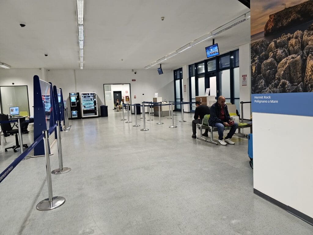 Now marginally dryer, I returned to the main landside area and began my short exploration of this. As you would expect from a small regional airport with relatively few flights, those expecting the luxury and number of facilities of the likes of Changi, Doha or Incheon would have been disappointed. However, given the airport’s size, I found the terminal to be pleasant enough, with this being clean, bright and reasonably modern. In the landside area, two vending machines could be found serving drinks and snacks, whilst a café was located next to the arrivals area which was open and ready to serve customers. Despite the lack of passengers, all five check-in counters were open and staffed, as was the shared information desk and ticket counter. On the walls throughout the terminal, photos from around Puglia could be seen on the walls promoting some of the region’s sights.