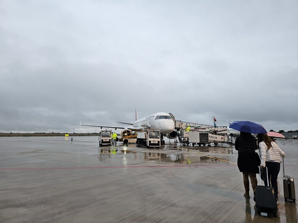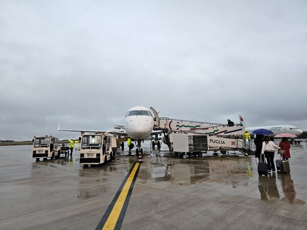 Several minutes later, one of the smartly dressed Aeroporti di Puglia staff members arrived and at 0739 they performed an announcement in Italian and English inviting passengers to board. Soon joining the queue, it wasn’t long before my boarding pass was scanned and passport checked, after which I was wished a nice flight. Providing a very pleasant end to my positive experience at Foggia Airport, just before heading outside I was handed a large Aeroporti di Puglia branded umbrella to protect me from the rain as I walked out the aircraft. This is something that I had only ever previously experienced whilst flying domestically in Korea, and so I was left rather impressed!