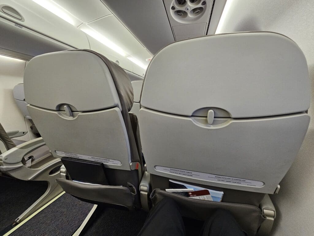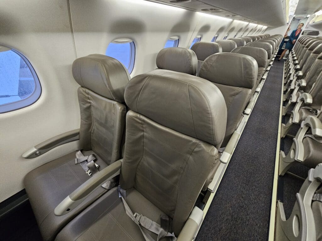 From there, I stepped into the small forward galley of the Embraer where I received a friendly greeting in Italian from one of the flight attendants before turning right and entering the cabin. As with all Lumiwings aircraft, their Embraer does not feature a business class and all seats onboard are arranged in the ERJ-195 standard 2-2 configuration. In terms of the seats themselves, these are the standard E-Jet seats which can be seen across the world. Those in the first few rows were covered in a light grey pleather which I believe was inherited from Azul, whilst the majority of seats sported elephant grey pleather covers. Despite this mismatch in seat covers, the interior of the jet appeared to be smart, clean and tidy, and my first impressions were good. This was also assisted by the fact that I received a further two friendly greetings as I trundled down the cabin to my seat.