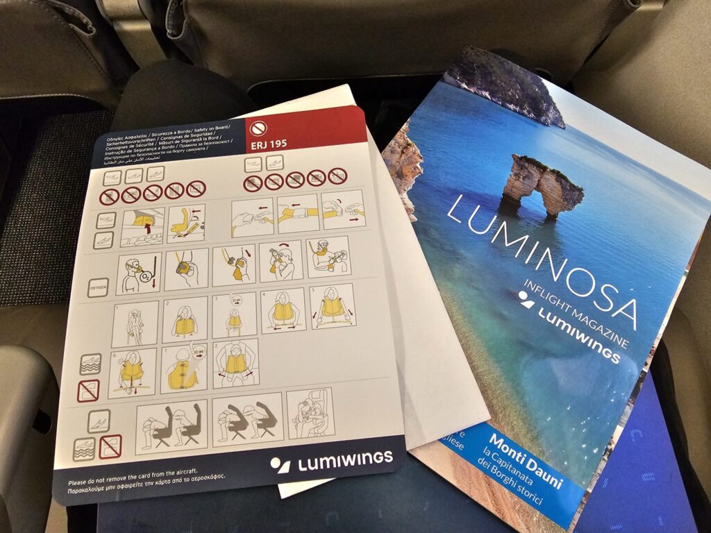 With little to see outside, I decided to flick through the 96-page inflight magazine. This featured an impressive total of over twenty articles which primarily focused on topics related to their Italian destinations and things to do in the vicinity of these. These came in addition to a small section about Lumiwings and plenty of advertisements for a wide range of goods and services. Published by an Italian company, only some articles were translated into English although this was neither surprising nor a complaint as I appeared to be the only non-Italian passenger on that morning’s service. Whilst I was unable to find the magazine’s date of publication, this did not seem to be relatively recent as it still listed Catania as a destination and lacked any mentions of both Lumiwings’ route to Mostar and their latest delivery.