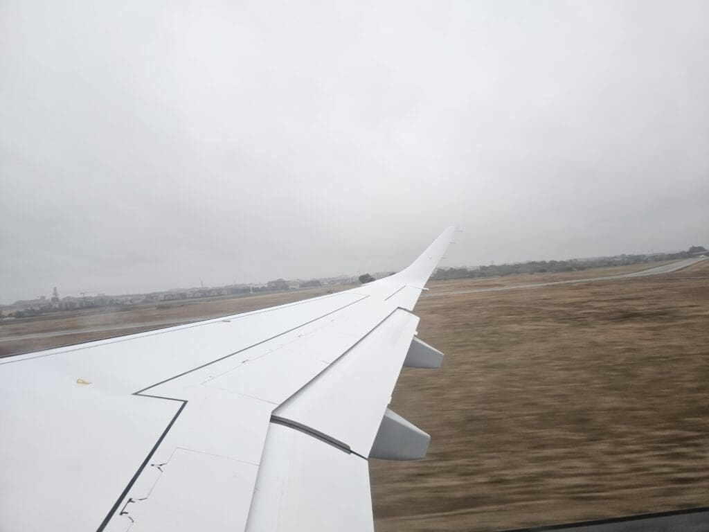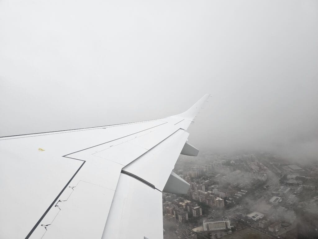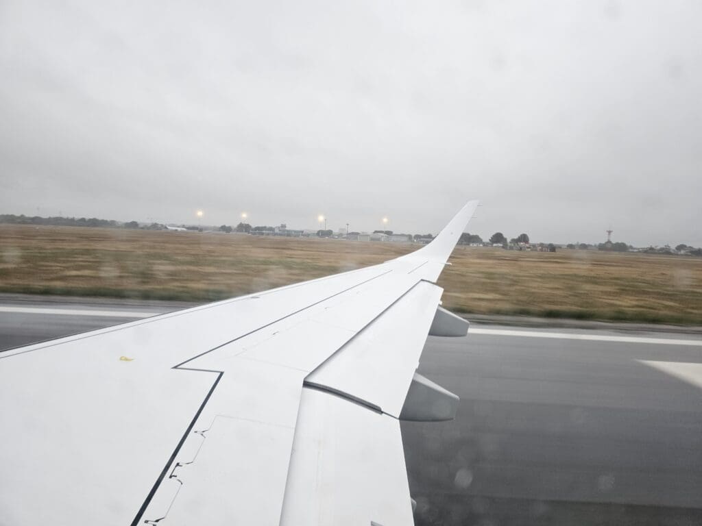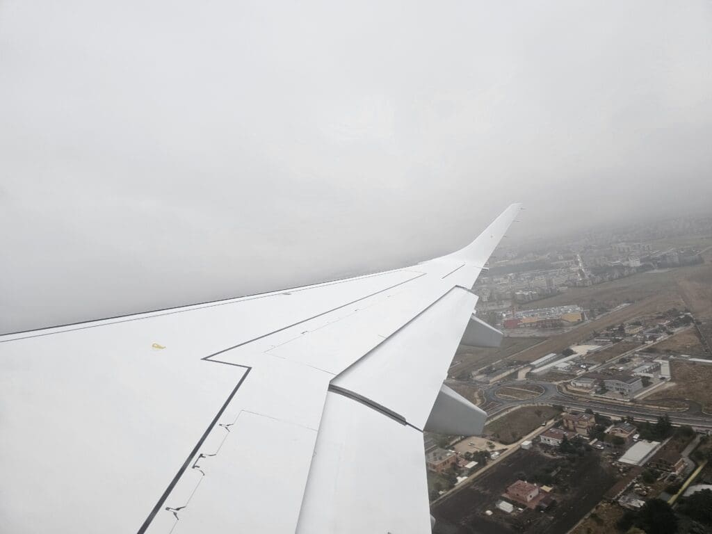 Eventually, the aircraft reached the opposite end of the runway and came to a quick halt. At 0817, with the brakes held, the engines partially spooled up before being released causing us to power down the runway with some vigour before rotating upwards into the rainy skies. Seconds after taking off, the rain-soaked industrial and retail areas neighbouring the airport could be seen although we headed into the clouds before reaching the city centre and so I was not treated to any final glimpses of Foggia’s main sights.