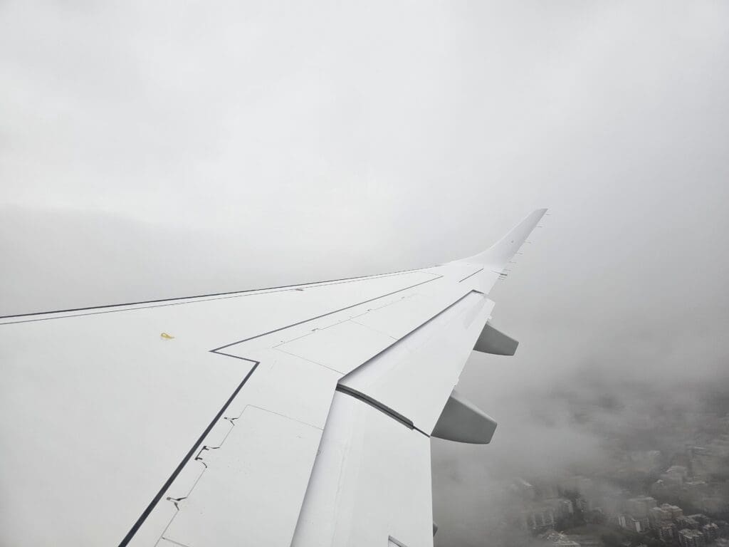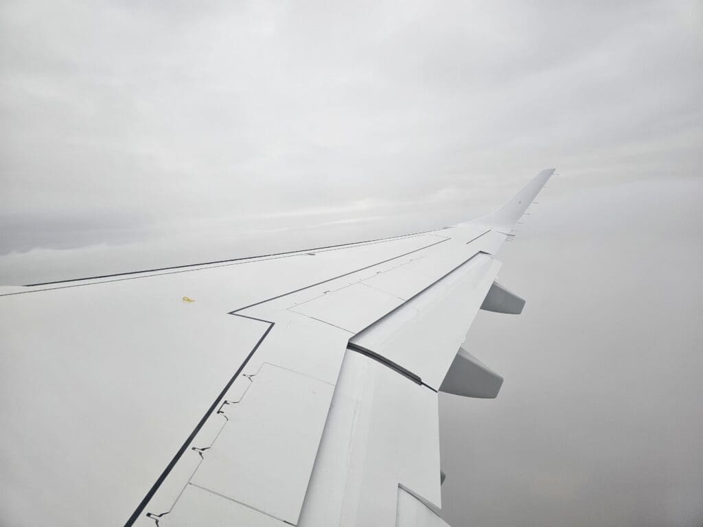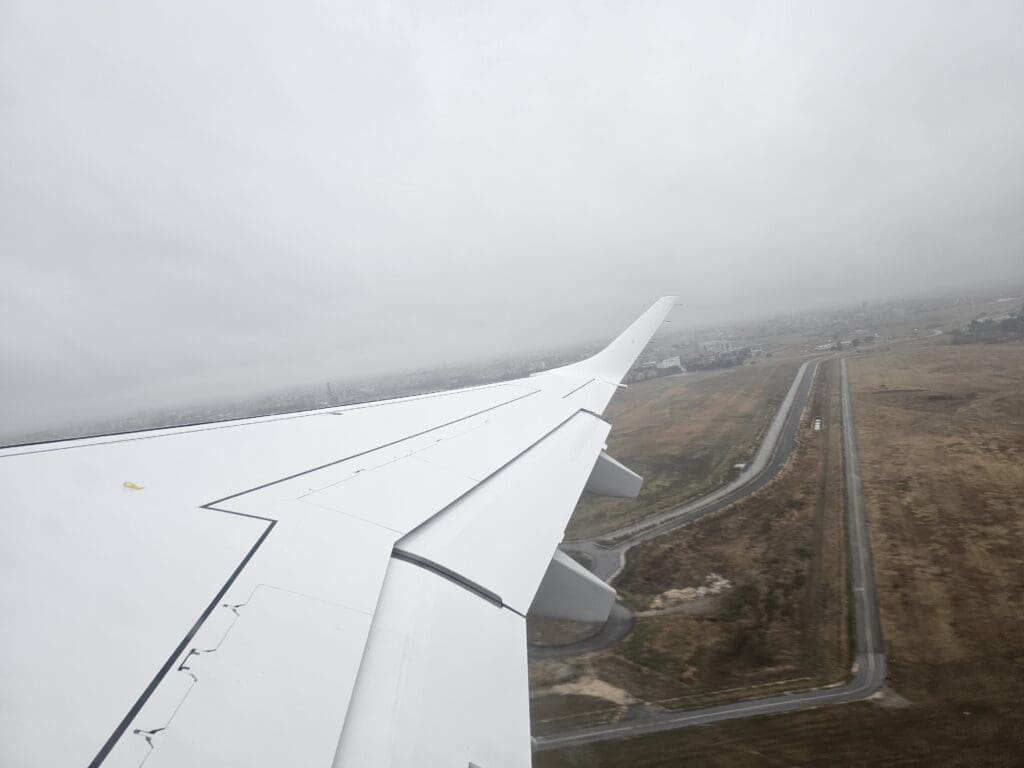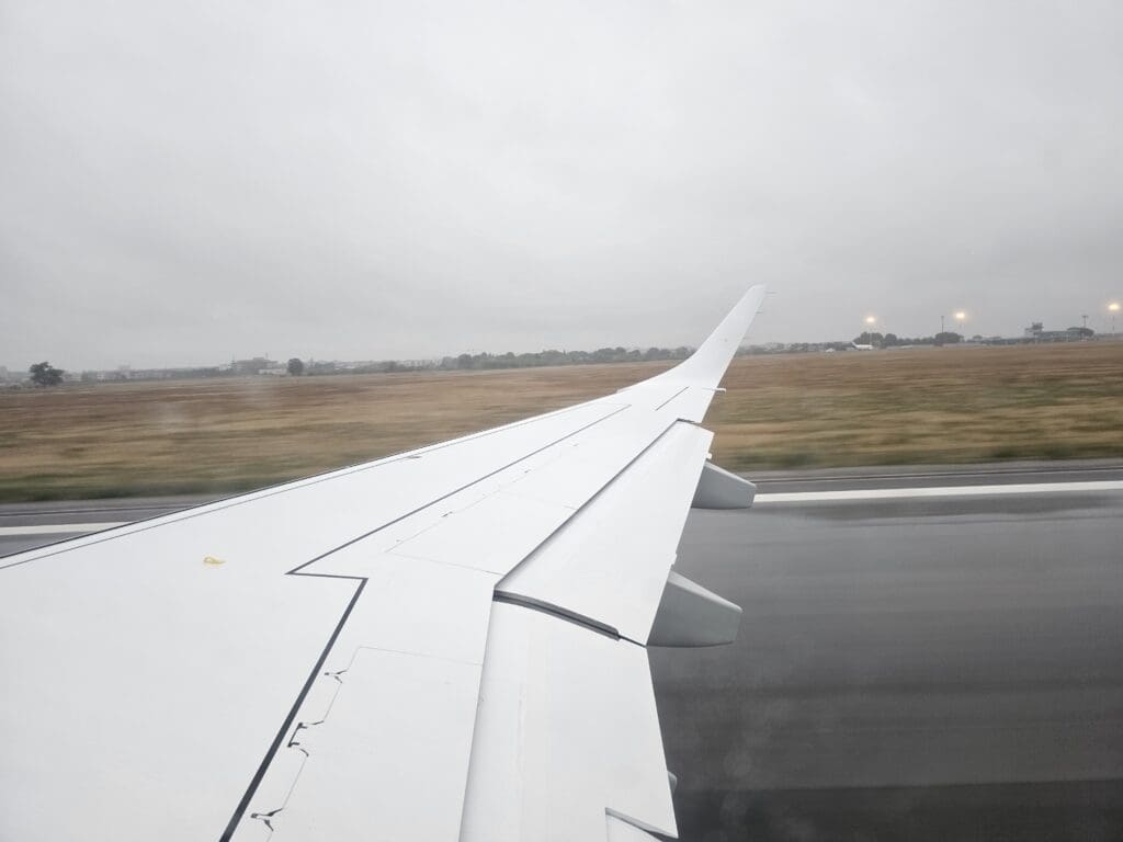 Eventually, the aircraft reached the opposite end of the runway and came to a quick halt. At 0817, with the brakes held, the engines partially spooled up before being released causing us to power down the runway with some vigour before rotating upwards into the rainy skies. Seconds after taking off, the rain-soaked industrial and retail areas neighbouring the airport could be seen although we headed into the clouds before reaching the city centre and so I was not treated to any final glimpses of Foggia’s main sights.