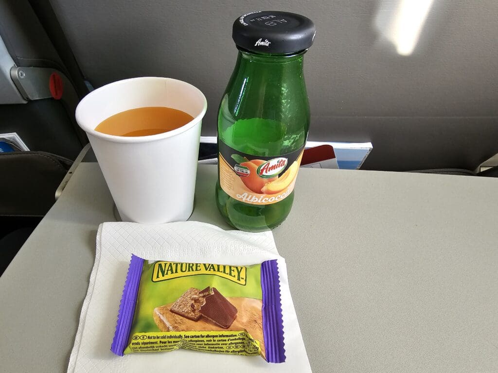 Soon, a service cart was rolled out from the rear galley and wheeled to the front of the cabin and was followed by another from the forward galley. After several minutes, the first cart arrived at which point the flight attendant went through the vast array of drink options in English, and advised that teas and coffees would come from the next trolley. Opting for an apricot juice, this was handed over to me in a 200ml glass bottle and was accompanied by a plain paper cup and a serviette. I was then offered the choice of either ‘yoghurt’ or ‘chocolate’. Choosing the latter, a packet of Nature Valley chocolate-coated biscuits was placed on the large tray table. Next up was the hot drinks cart, which was staffed by equally polite and friendly flight attendants. Upon reaching my row, I decided to go for a black coffee and was also presented with a basket containing two types of Greek baklava! Choosing one at random, I placed this on my tray and soon got to work on this very impressive (for a short-haul European flight) snack service.