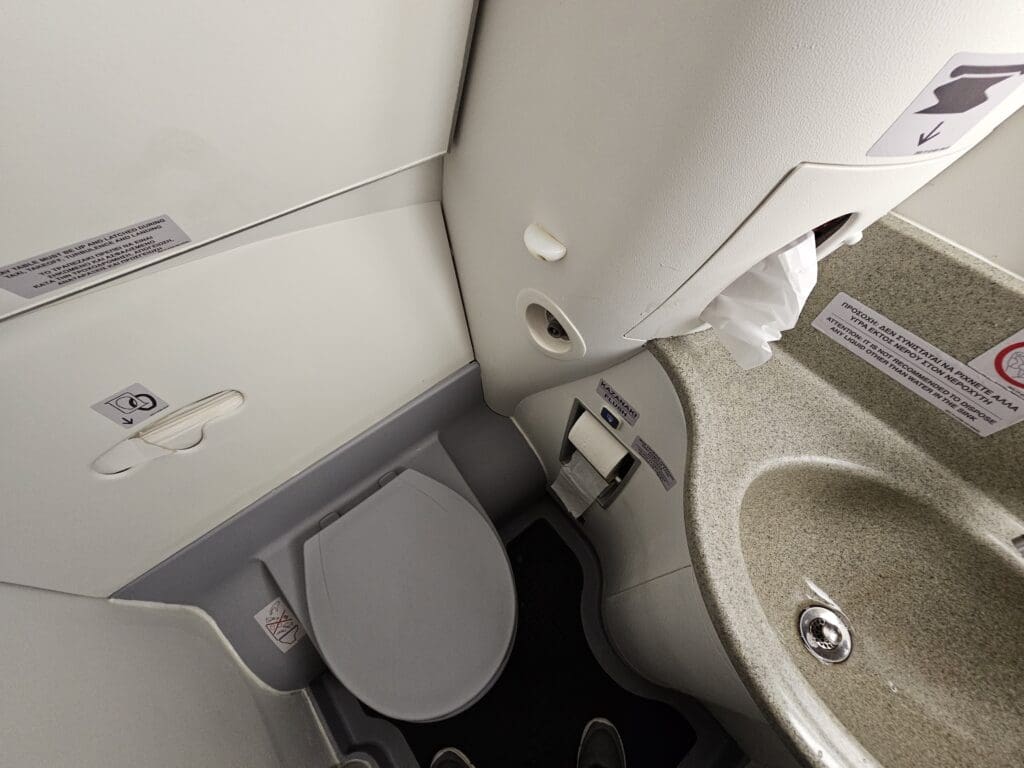 At 0853, the aircraft seemed to descend at a fairly steep rate, which was a little confusing as we were only over Florence and thus had a fair distance to go until Milan. However, the descent was only temporary and we soon levelled off at 30,000 feet. Nevertheless, with this hinting that we were speeding towards the end of the flight, I opted to make a trip to one of the Embraer’s two lavatories – one of which is located at the rear of the aircraft and the other at the front. With a queue having formed for the rear lavatory, I decided to head to the vacant forward lavatory. Upon entering this, I found this to be more cramped than a typical E-Jet’s rear lavatory, primarily due to the curvature of the fuselage which meant that I was unable to stand upright. However, Lumiwings was hardly to blame for the Embraer’s design and I was left with few complaints, with this being stocked with the basics and in a clean and presentable state. Once again, there were no signs of the aircraft’s previous career in Brazil, with all Portuguese signs having been replaced by their Greek equivalents.
