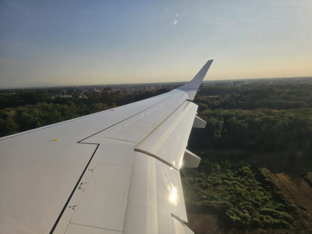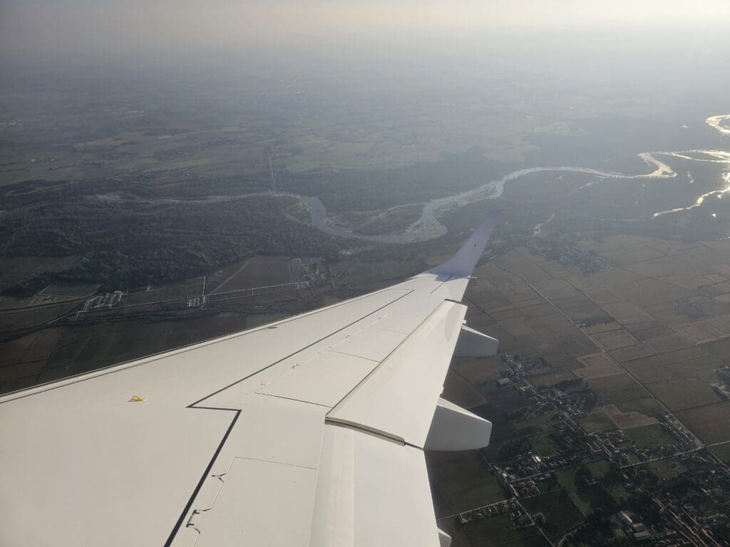 As we sank, one of the flight attendants performed an announcement advising that we could expect to land in twenty minutes before giving a brief overview of the weather in Milan. Below, good views of the mountainous terrain continued until the mountains suddenly disappeared and were replaced by the sight of fields as we passed the town of Pavia. From there, the aircraft continued northwards and flew parallel to the course of the Ticino River, following this to Milan. With the wind blowing in from the north, and arriving from the south, nothing more than very slight changes to our course were required as we approached Milan and it wasn’t long until the Embraer’s flaps were lowered in preparation for our arrival.