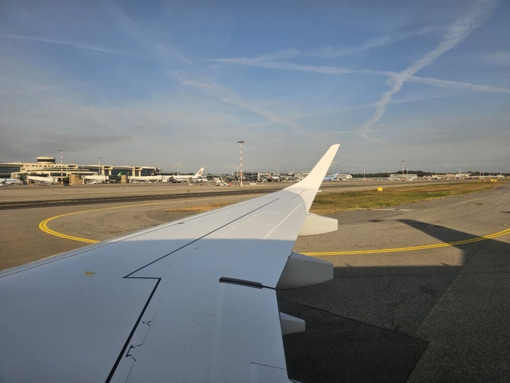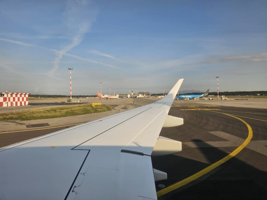 Once the cabin door had been shut, it wasn’t long before one of the flight attendants performed their welcome announcement in Italian and English which then transitioned into the safety demonstration. This consisted of the safety instructions being read out and a couple of crew members performing a demonstration in the aisle. Talking of the crew, that morning the flight seemed to be staffed by a mixture of both Italian and Greek flight attendants, although unsurprisingly all of the latter crew seemed to speak at least a basic level of Italian. On a side note, there was no word from the cockpit for the duration of the flight, although this was perhaps owing to the assumed pilots’ lack of Italian language skills. As the demonstration came to an end, the usual humming could be heard as the Embraer’s two General Electric CF34-10E7 engines spooled into life.