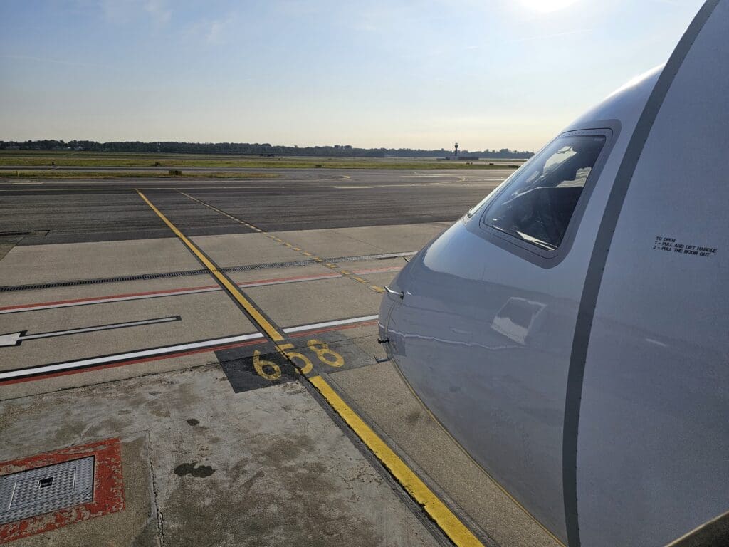 As I neared the aircraft, I was impressed to see that a step-free ramp had been wheeled up to the aircraft’s L1 door. Whilst such a device is common in North America and across much of Asia, I had only ever seen these once before in Europe, namely in Inverness. However, I am a firm believer that such technology is something that more handling companies should be investing in! After making my way up the ramp I joined a short queue and soon returned my umbrella to a rather rain-soaked member of ground staff.
