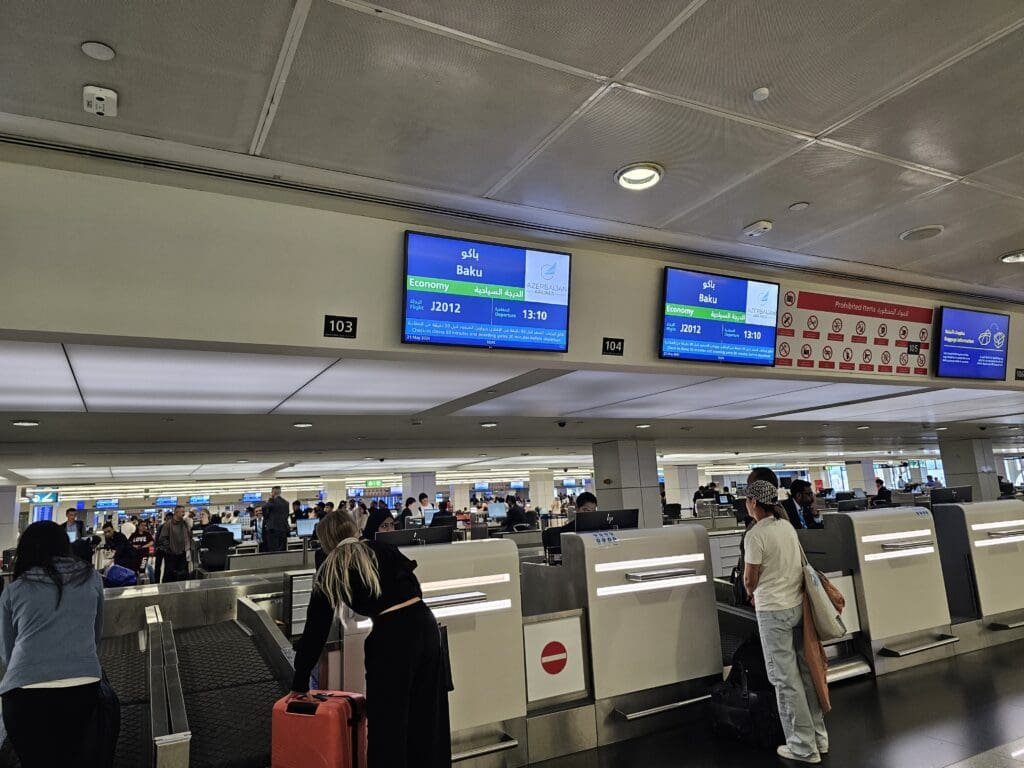 Fortunately, after about a minute, I found my passport and joined the short queue of Baku-bound passengers. A few minutes later, the desks opened, and after about three minutes of shuffling forwards, I reached the front of the queue. That day, Azerbaijan Airlines occupied four desks – two for those in Economy, and one each for those in Premium Economy and Business Class. Seeing as Azerbaijan Airlines operates two daily flights between Baku and Dubai, a widebody flight with the Boeing 767 or Boeing 787 Dreamliner and an Airbus A320 operated service, I wasn’t surprised that plenty of the airline’s signage could be seen around the four desks. Once at the desk, the Dnata agent manning this did not seem to be particularly warm or friendly, however, they were able to check me in quickly and without issue, and I was soon able to continue onwards. With my two Azerbaijan Airlines branded boarding passes in hand, I had no reason to remain in the landside portion of the terminal and steamed onwards in the direction of security and immigration.