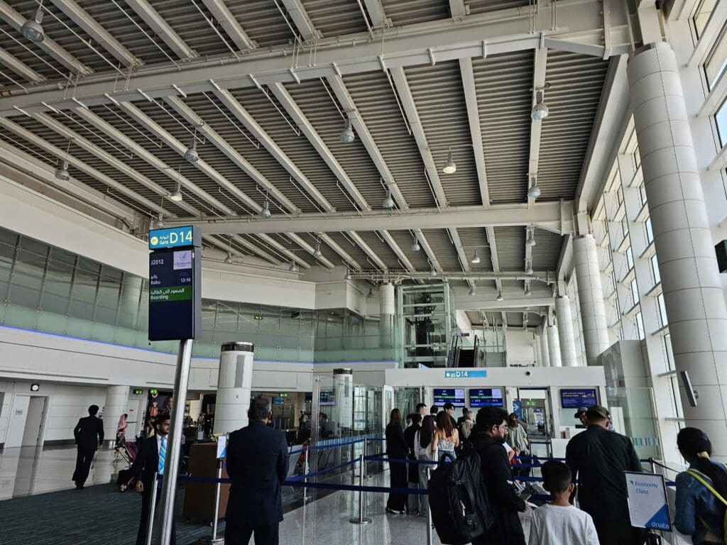 According to my boarding pass, boarding was scheduled to commence a total of sixty minutes before departure at 1210. Despite being somewhat sceptical that it could take a full hour to board a relatively low-density Boeing 787, as the clock struck midday, I decided to saunter over to Gate D19. Upon arriving there, indicating that boarding would indeed commence on time, an army of Dnata agents could be seen at the gate podium typing away and undertaking their final preparations for boarding. Whilst there was still plenty of time to go until our flight was scheduled to depart, there didn’t seem to be too many people lingering around, giving me some hope that I would be in for a quiet ride up to Azerbaijan.