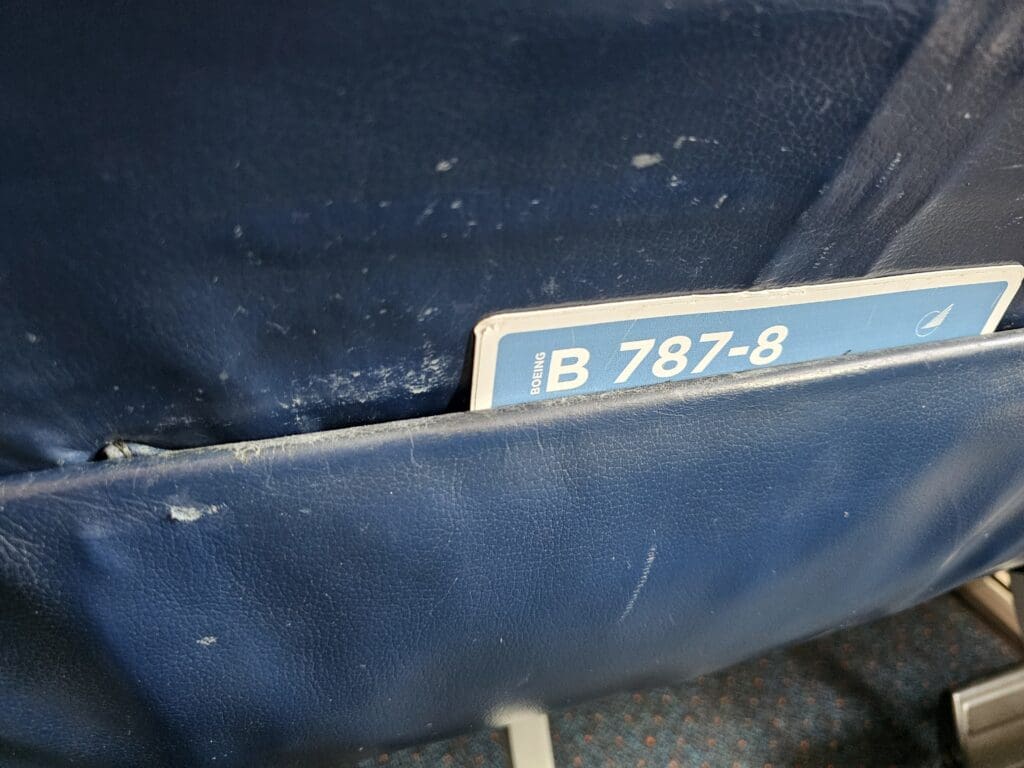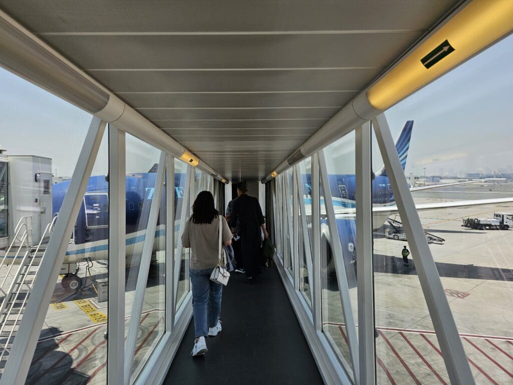 At 1210, a pre-recorded announcement rang out in English, Arabic and Russian, which advised passengers of the commencement of boarding. That lunchtime, all passengers were invited to board at once, with no priority appearing to be given to those in Business, elite members of the Azal Miles program or those requiring assistance. At this time, a short queue formed, and after joining this, thanks to the army of staff on hand, it wasn’t long before I shuffled forward and was greeted by a wonderfully friendly Dnata agent. Once they had scanned my boarding pass, checked my passport and wished me a nice flight by name, I voyaged down the glass jetbridge towards the waiting Dreamliner. Like many aviation enthusiasts, I am quite a fan of Azerbaijan Airlines’ unique mostly blue livery which seems to suit the Dreamliner well and is the polar opposite of the all too increasingly common plain and boring liveries of today. However, as I neared the aircraft, I couldn’t help but notice that this livery required a touch-up and was fading in plenty of patches across the fuselage.