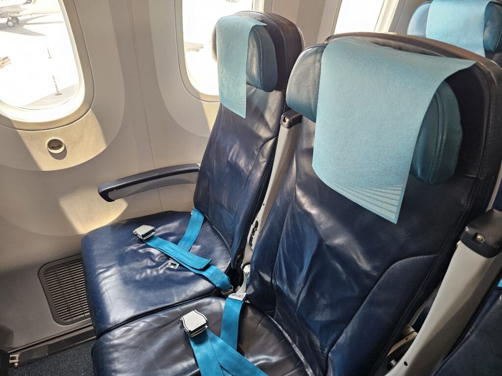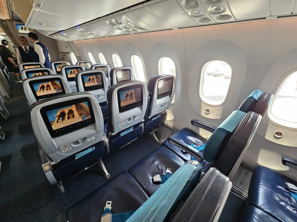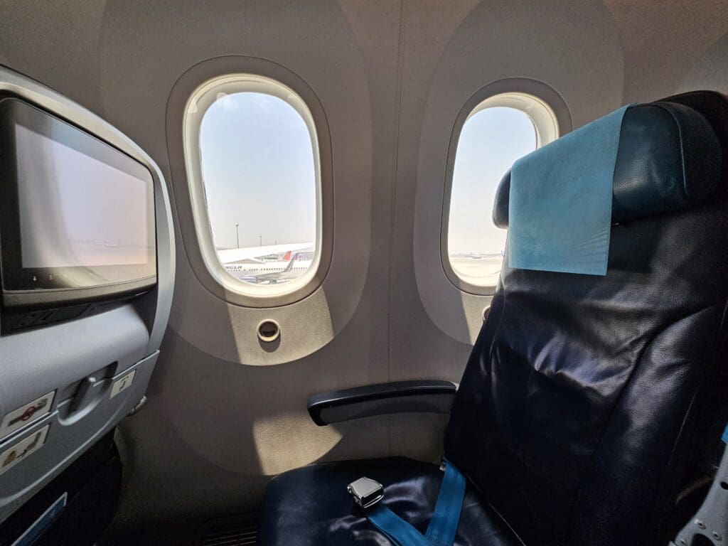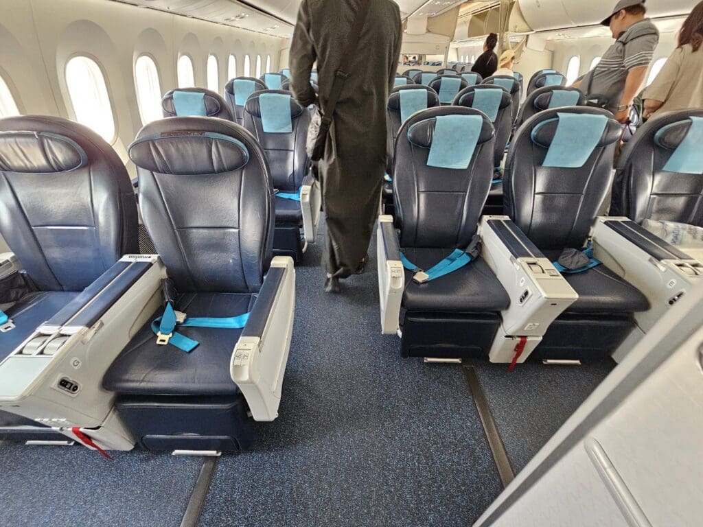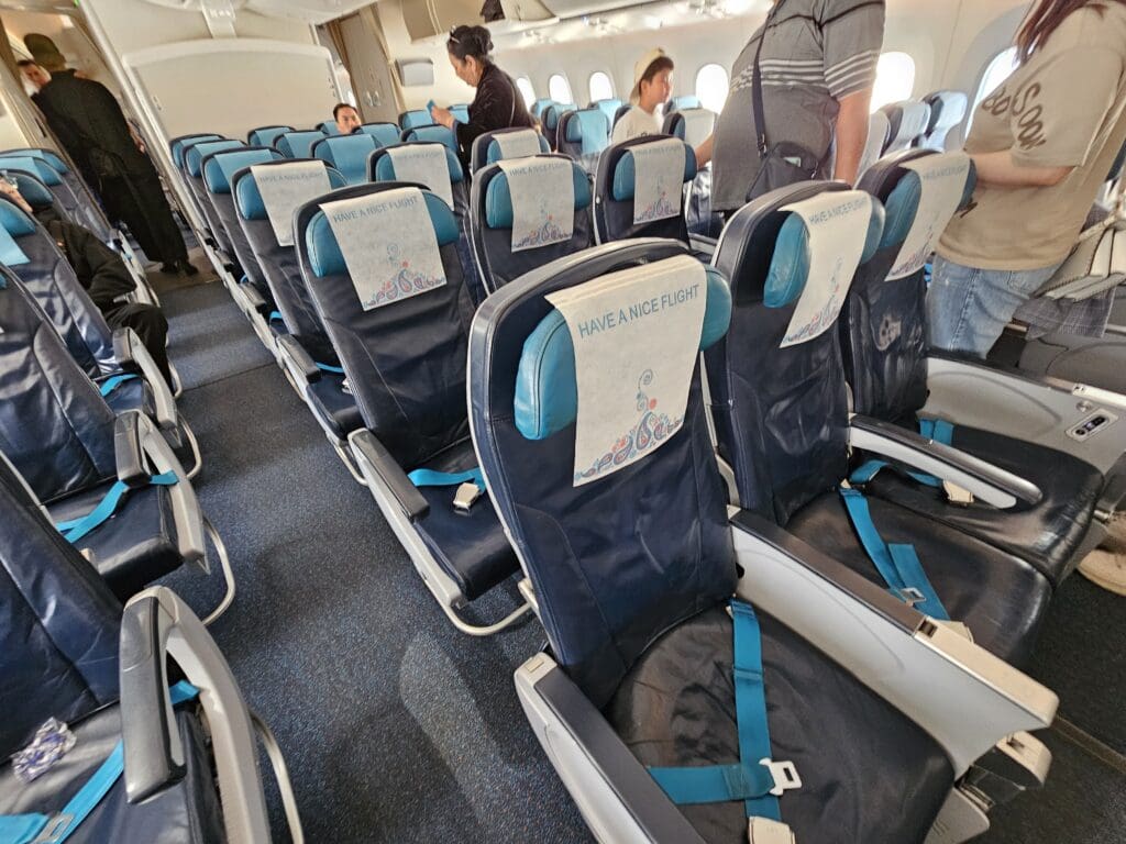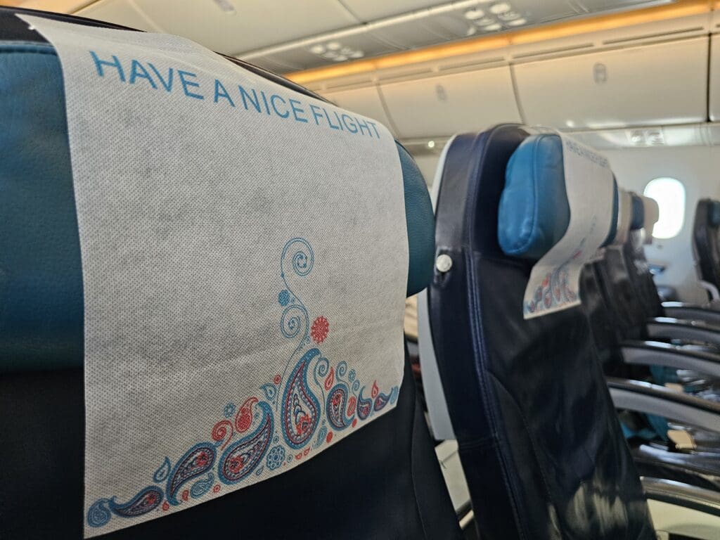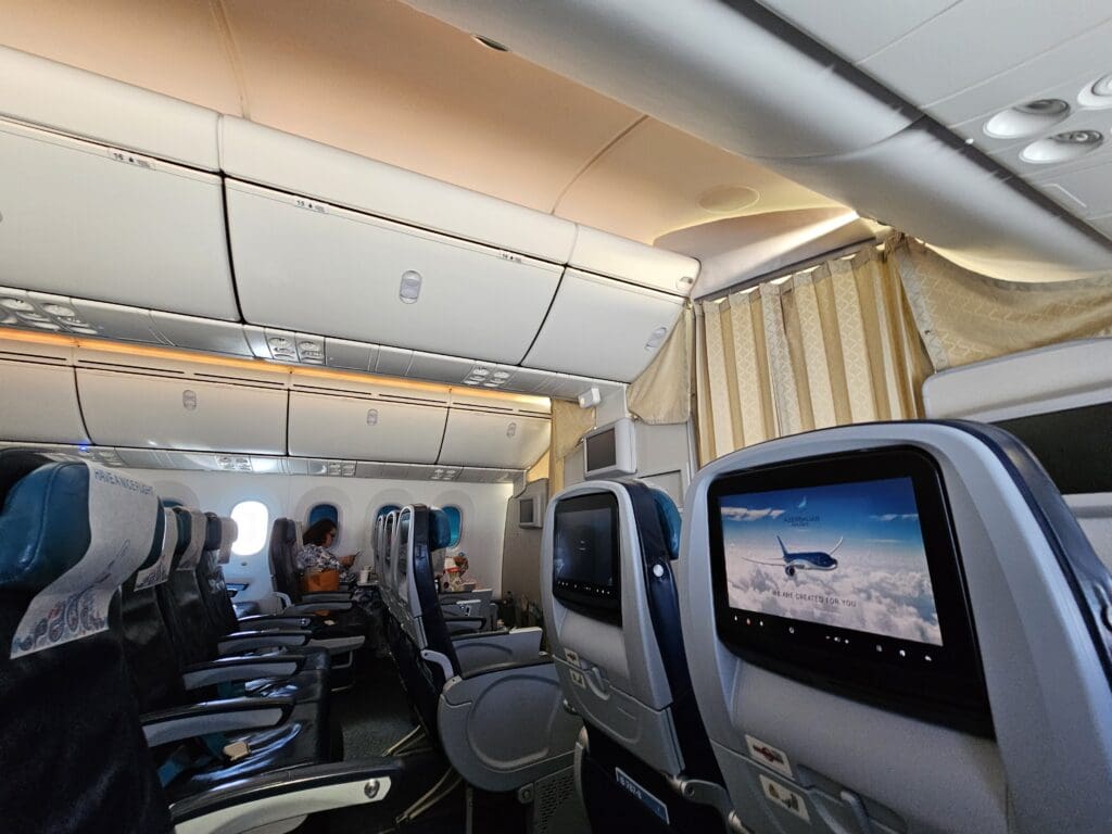 Following a short wait, I stepped aboard via the L2 door and was immediately greeted in Russian by one of the flight attendants. Upon showing my boarding pass, I was pointed down the second aisle and soon entered the Dreamliner’s large Premium Economy cabin. Interestingly, this cabin is unique to Azerbaijan Airlines’ two Boeing 787-8 Dreamliners, and cannot be found on their Boeing 767s or any of their narrowbody fleet. This features five rows of comfortable-looking Timco recliners in a 2-3-2 configuration. At first glance, these seemed to be more spacious than your typical Premium Economy seats and are the same model of seat that several leisure and low cost Dreamliner operators market as a Business class product. Being one of the first passengers to board the aircraft, I didn’t have to stop too many times as I trundled down the cabin and soon arrived in the forward Economy cabin where I received a quiet welcome in Russian from one of the flight attendants.