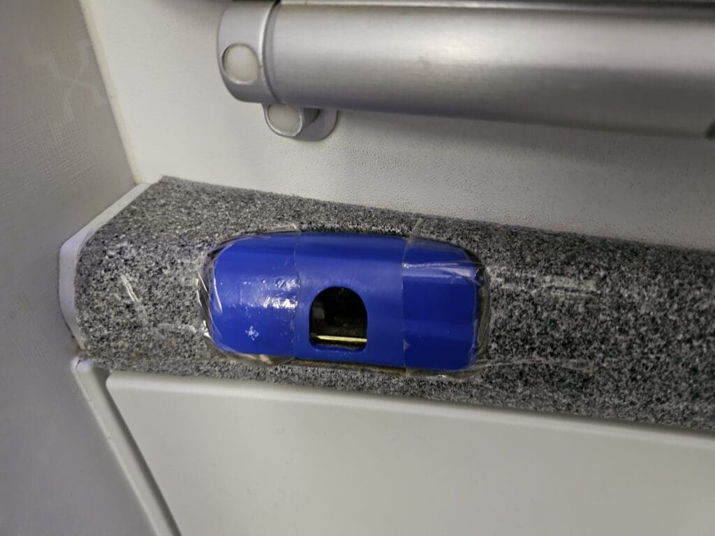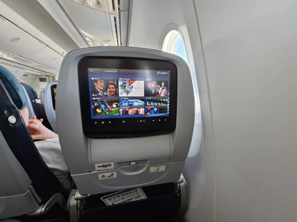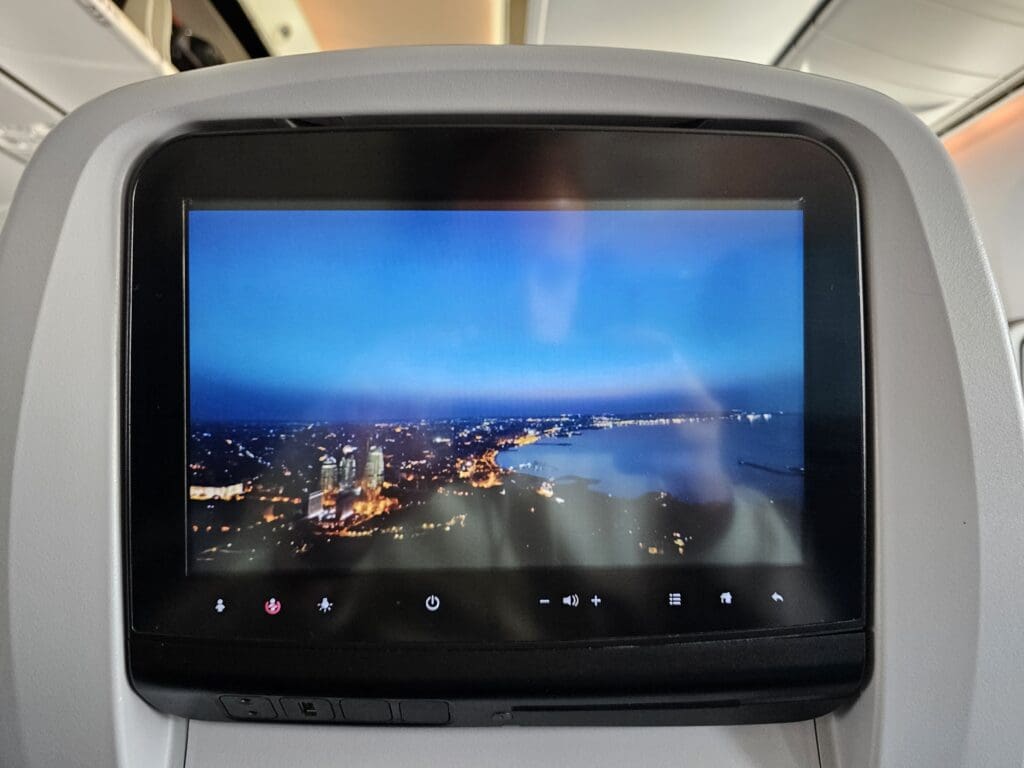Despite Azerbaijan Airlines’ excitingly colourful livery, sadly, the interior of their Dreamliners is on the whole, plain and fails to provide anything memorable or out of the ordinary. In Economy, each seat is covered in dark pleather and topped with an adjustable headrest partially covered by a disposable turquoise fabric antimacassar. Distinguishing pre-reservable seats in the bulkhead and exit rows, and at the front of the forward Economy section, these seats feature a white disposable fabric antimacassar featuring a swirling pattern and the phrase, ‘Have a nice flight’. Each seat comes with a coat hook, a fold-down footrest, a bifold tray table and a relatively modern Panasonic touchscreen inflight entertainment screen. Beneath each screen, a USB port could be found, whilst two universal plug sockets were provided for each bank of three seats, although unfortunately, neither of these seemed to work that day. Finally, upon boarding, neither pillows nor blankets were provided as standard to those in Economy, although given the short length of the flight, this was not particularly surprising.