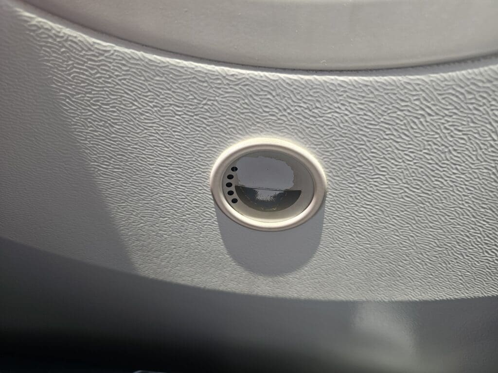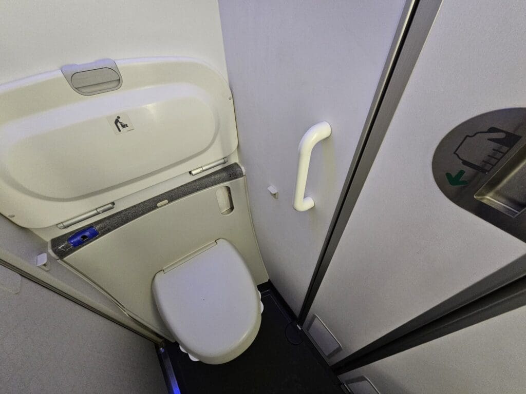 As we cruised northwards, thanks to my windowless window seat, I was unable to gaze out at the impressive and diverse landscapes of Iran as we headed north through the skies of the provinces of Kerman and Meybod. Feeling a little tired and wanting to save the delights of Azerbaijan Airlines’ inflight entertainment system for my longer flight to London, I drifted off to sleep and remained in the land of nod for about twenty minutes. Having been woken up by a few jolts of short-lived turbulence, I noticed that my neighbours had arisen for a lavatory break and so I decided to follow suit. In total, four lavatories are available for Economy class passengers, all of which are sandwiched between the two Economy cabins. Choosing one of these at random, upon entering the lavatory, I found this to be a little messy, and like the rest of the cabin, this seemed to be in a battered and worn state. Nevertheless, this served its purpose and was stocked with the basics.