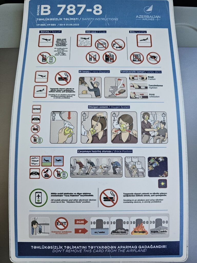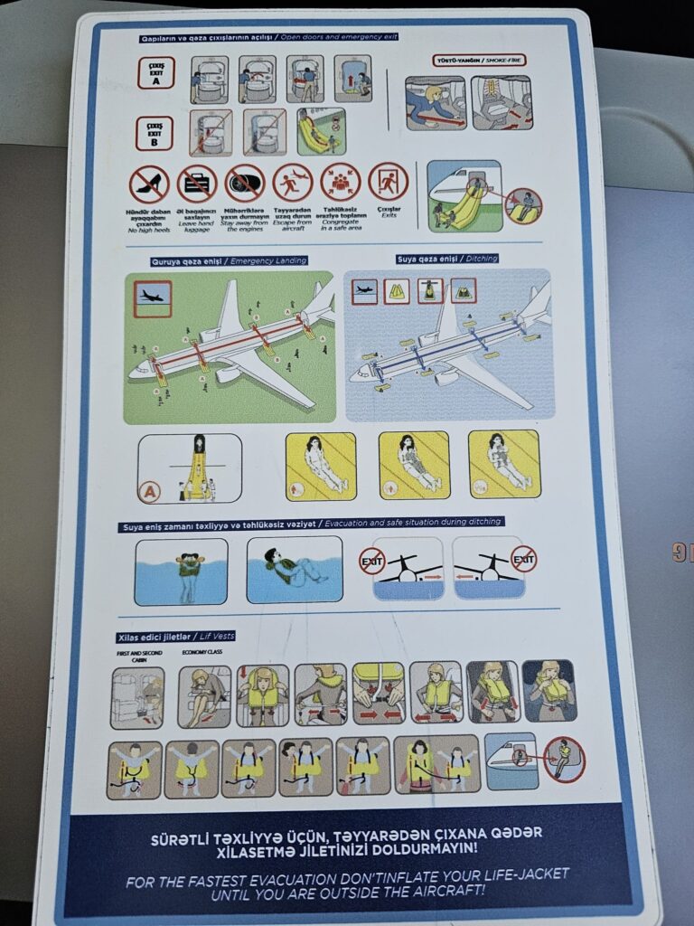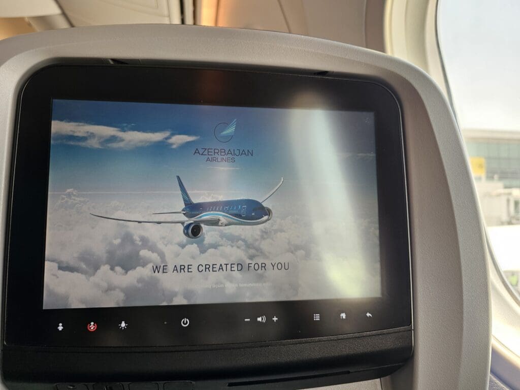Perhaps thanks to the early start to boarding, the final passenger made it onto the aircraft with around ten minutes to go until our scheduled departure time. Looking around, the cabin seemed to be about 70% full and it seemed that the vast majority of passengers took the form of homeward-bound Russian tourists, presumably connecting onto Azerbaijan Airlines’ evening flights to Moscow and St Petersburg. Despite Azerbaijan Airlines’ bargain fares between Dubai and London, I failed to hear any British accents during the flight. Once all were onboard, the upbeat traditional music came to an end before the Purser performed a trilingual welcome announcement in Azerbaijani, Russian and English. This contained the usual welcomes, thanks and all the usual information about the flight, as well as a few quick safety messages. Whilst this was underway, several crew members passed through the aisles, distributing fairly standard economy-quality headphones. Almost immediately after the Purser completed their welcome announcement, Azerbaijan Airlines’ safety video took over the inflight entertainment screens. This took the form of a seemingly high-budget production that takes passengers on a journey through Azerbaijan, highlighting some of the country’s culture and sights whilst simultaneously going through the safety procedures.